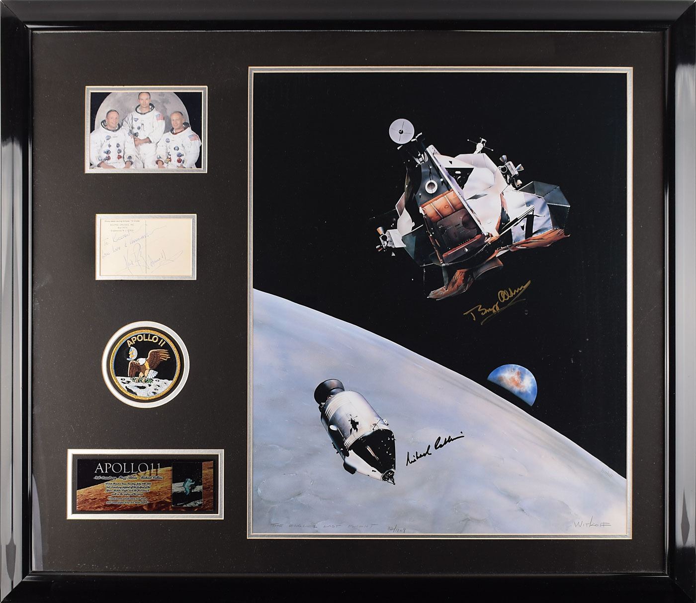 Impressive framed display honoring the astronauts of the historic Apollo 11 mission, which includes: an ink signature and inscription, "To Kirsten, Long Life & Happiness, Neil Armstrong, Apollo 11," on the reverse of an off-white 5.25 x 3.25 postcard; and a limited edition color 21.75 x 27 lithograph entitled 'The Eagle's Last Flight,' depicting the Apollo 11 command and lunar modules in orbit, with the Earth rising in the distance, numbered 32/1969, signed in gold ink, "Buzz Aldrin," and in black felt tip, "Michael Collins." The lithograph is also signed in pencil by the artist, Dan Witkoff. The items are double-matted and framed with a crew image, reflective plaque, and embroidered mission patch to an overall size of 40.75 x 35.5. In fine condition, with light wear to frame edge.