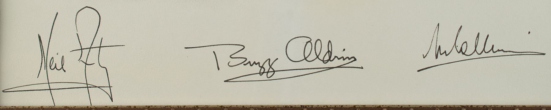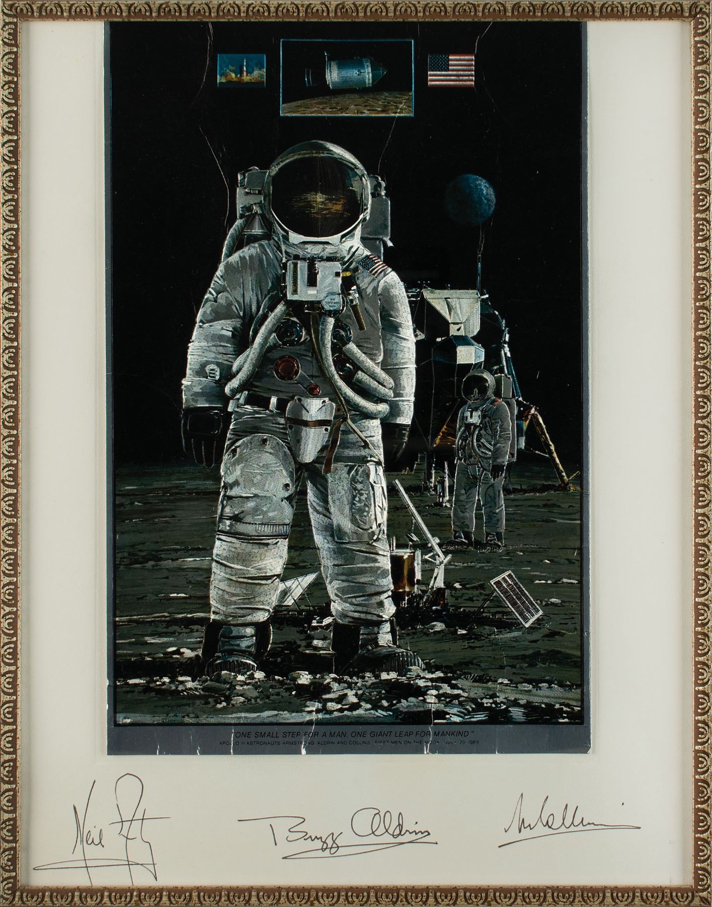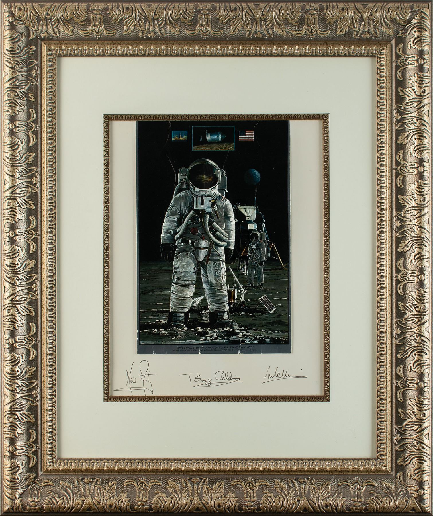 Sought-after color 7.5 x 11.25 foil etch reproduction of a John Berkey painting entitled 'One Giant Leap,' which depicts Neil Armstrong standing on the surface of the moon, with Buzz Aldrin, the Lunar Module Eagle, the Earth, and small images of the rocket launch, orbiting Command Module Columbia, and the American flag visible in the background. The foil etch is affixed to the original 10.25 x 13.25 presentation mount, which is signed in black ink, "Neil Armstrong," "Buzz Aldrin," and "M. Collins." Handsomely matted and framed to an overall size of 21 x 25. In very good to fine condition, with creasing to the image. Only 75 of these personally autographed foil pictures were made for the space exhibit at the 1972 North Carolina State Fair. A wonderful display piece featuring a rare artist's portrayal of both Armstrong and Aldrin on the lunar surface, signed in full by the heroic astronauts of the Apollo 11 mission.