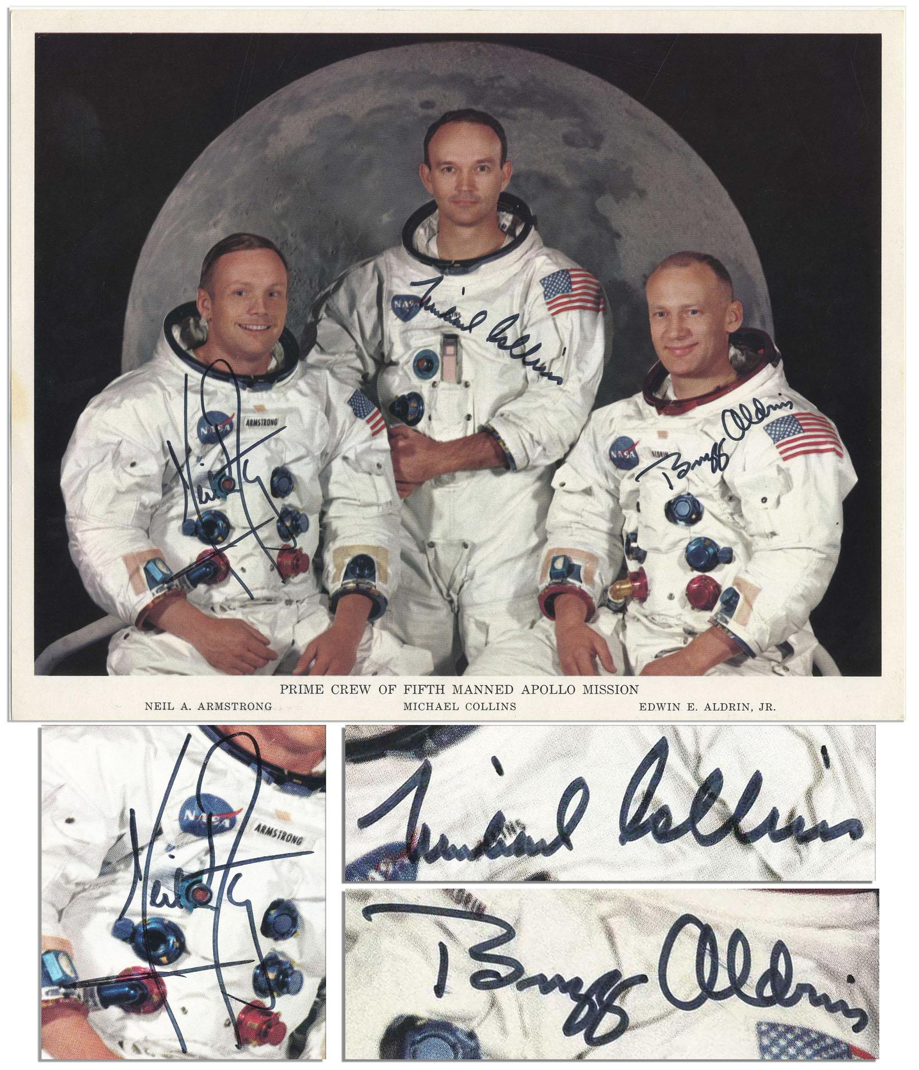 Very nice uninscribed example of an Apollo 11 crew signed photo. 10'' x 8'' official NASA glossy color photograph is signed in black marker by Neil Armstrong, Michael Collins and Buzz Aldrin. Type along bottom reads: ''Prime Crew of the Fifth Manned Apollo Mission'' and a NASA caption on verso reads: ''…Apollo 11 is scheduled to be the National Aeronautics and Space Administration's first lunar landing mission…'' Bright, bold signatures. Near fine condition.