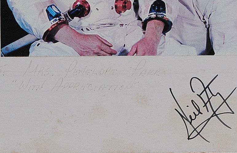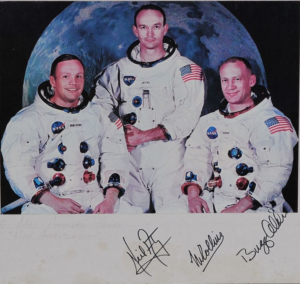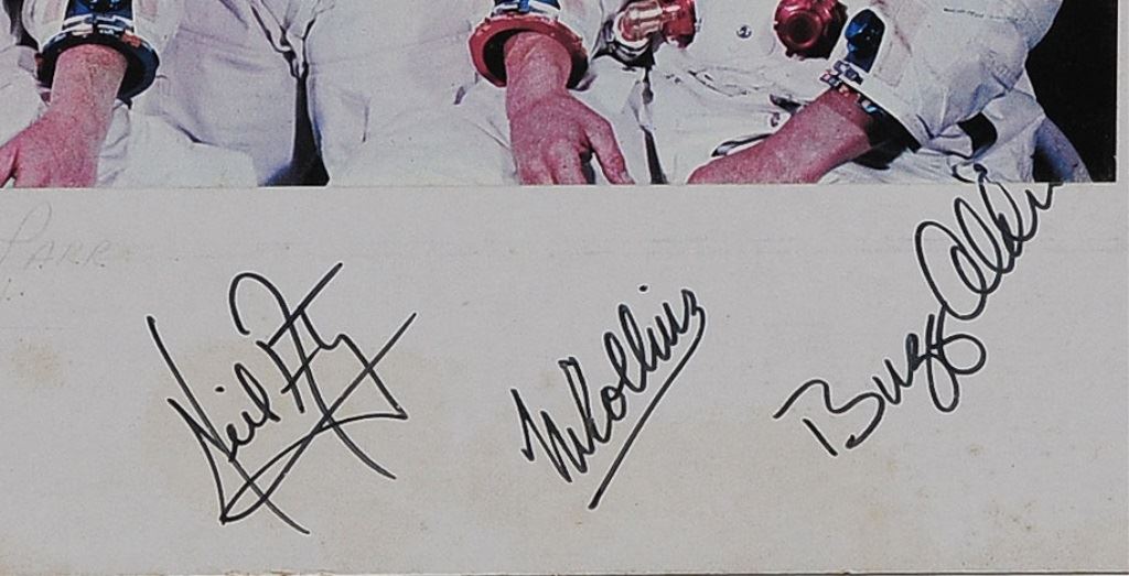 with ink signatures of astronauts Neil Armstrong, Michael Collins, and Buzz Aldrin