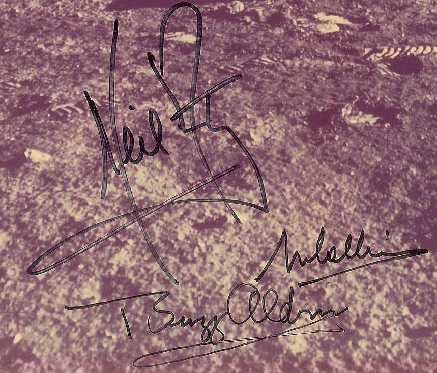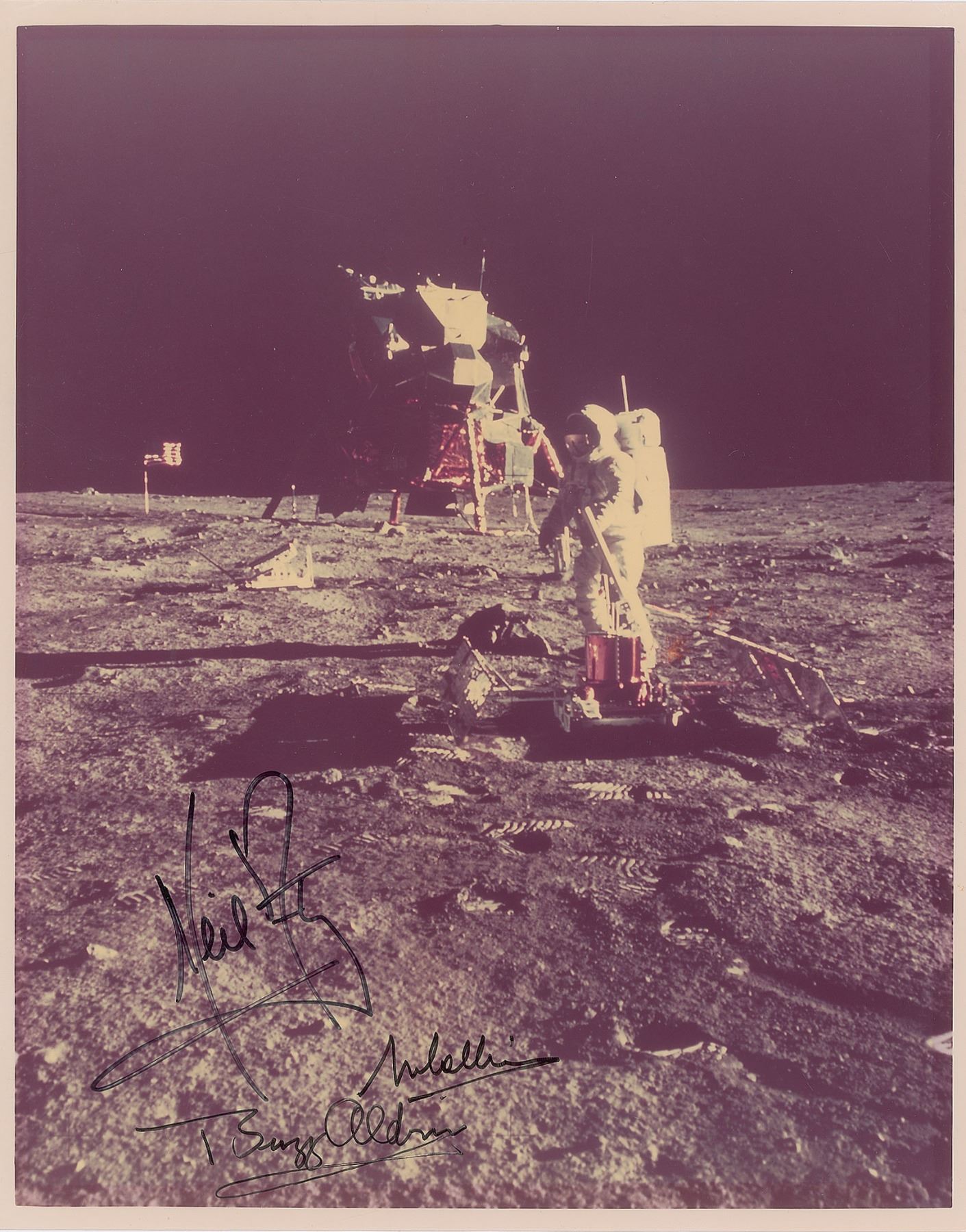 Remarkable official color semi-glossy 8 x 10 NASA photo of LMP Aldrin deploying the solar panels of the seismometer during the historic EVA of the Apollo 11 mission, with the Lunar Module Eagle and the American flag visible in the background, signed in black felt tip, "Neil Armstrong," "M. Collins," and "Buzz Aldrin." Reverse bears faded purple NASA caption text. In very good to fine condition, with scattered small surface creases and a paperclip impression to the top edge. A decidedly uncommon fully signed photo of the groundbreaking Apollo 11 mission.