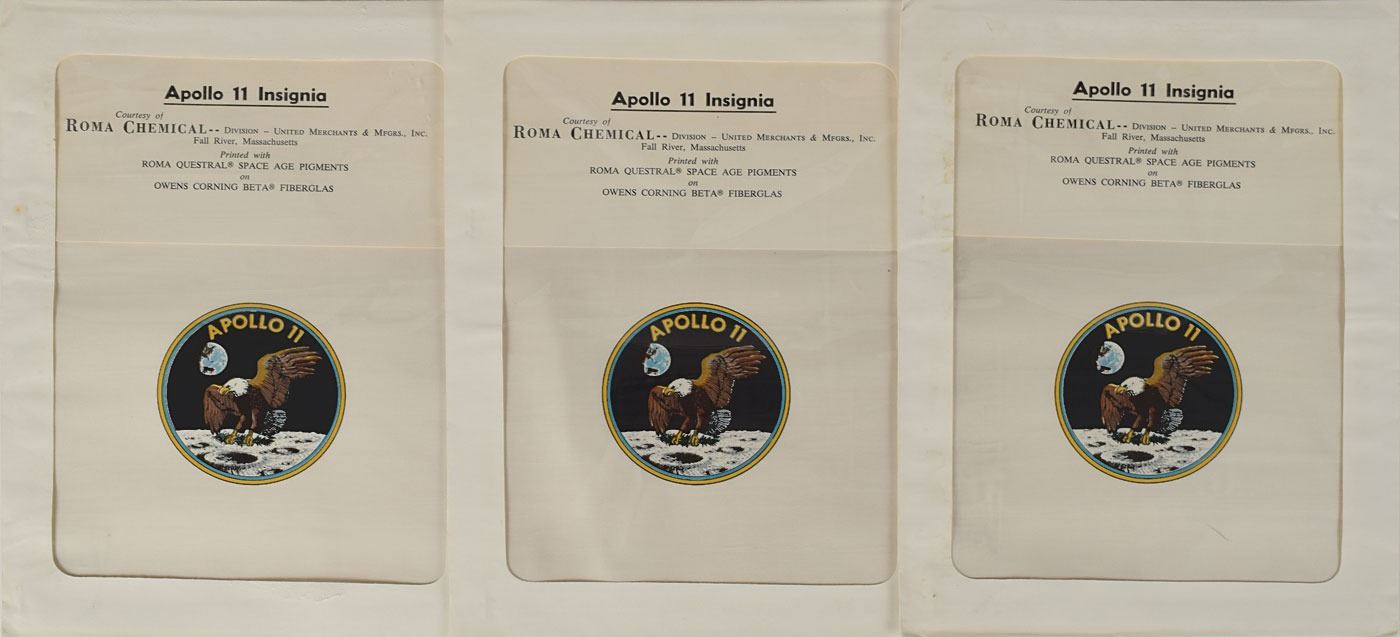Group of three swatches of Beta cloth, each measuring approximately 7? x 6.5?, featuring 3.25? diameter Apollo 11 mission insignia in the center. Each is individually sealed in a Roma Chemical envelope, with paper insert reading: "Apollo 11 Insignia, Courtesy of Roma Chemical—Division—United Merchants & Mfgrs., Inc., Fall River, Massachusetts, Printed with Roma Questral Space Age Pigments on Owens Corning Beta Fiberglas." In overall fine condition, with some wear to the envelopes. From the collection of aerospace memorabilia specialist Ken Havekotte. A desirable grouping of Beta patches produced in 1969, the year of the first lunar landing.