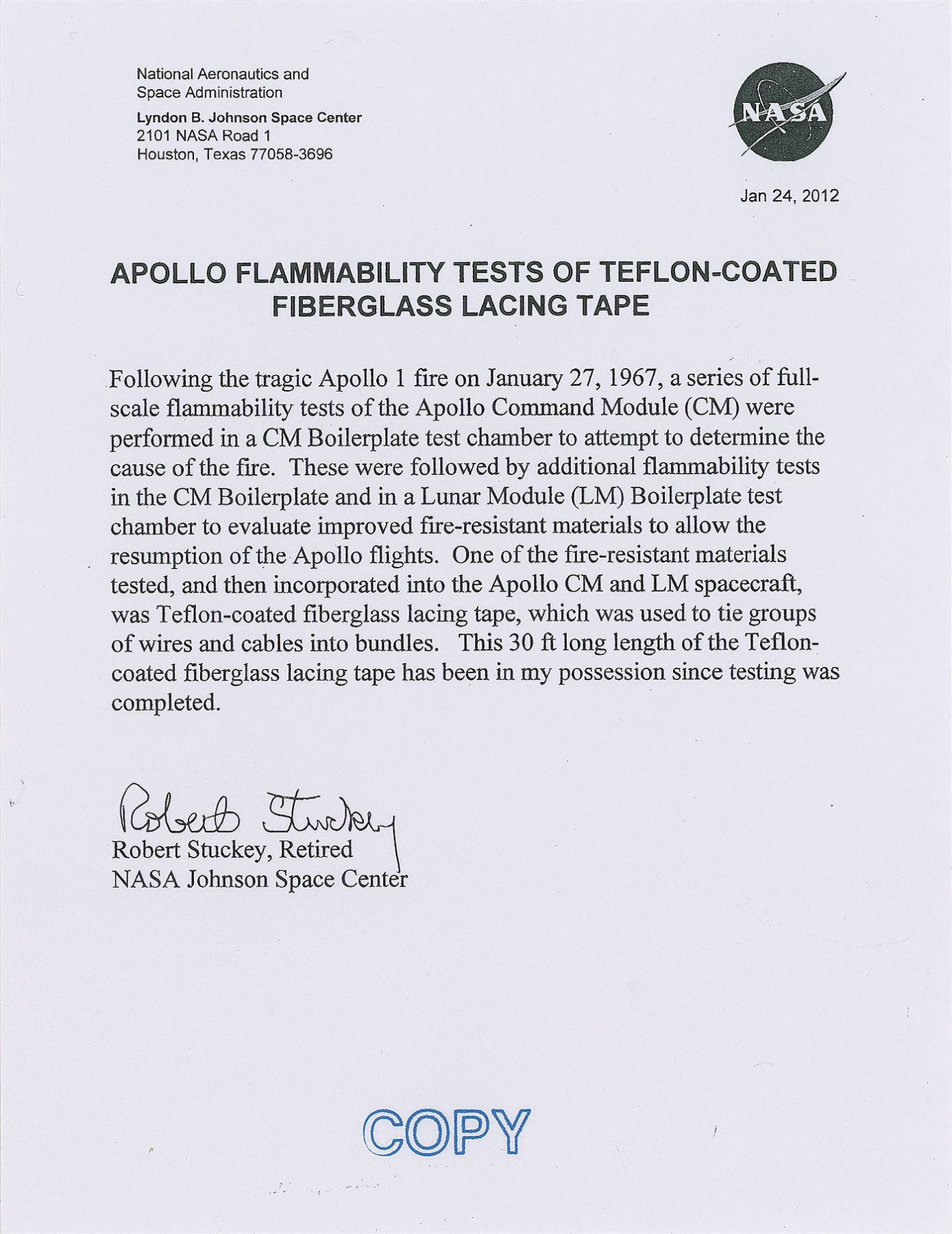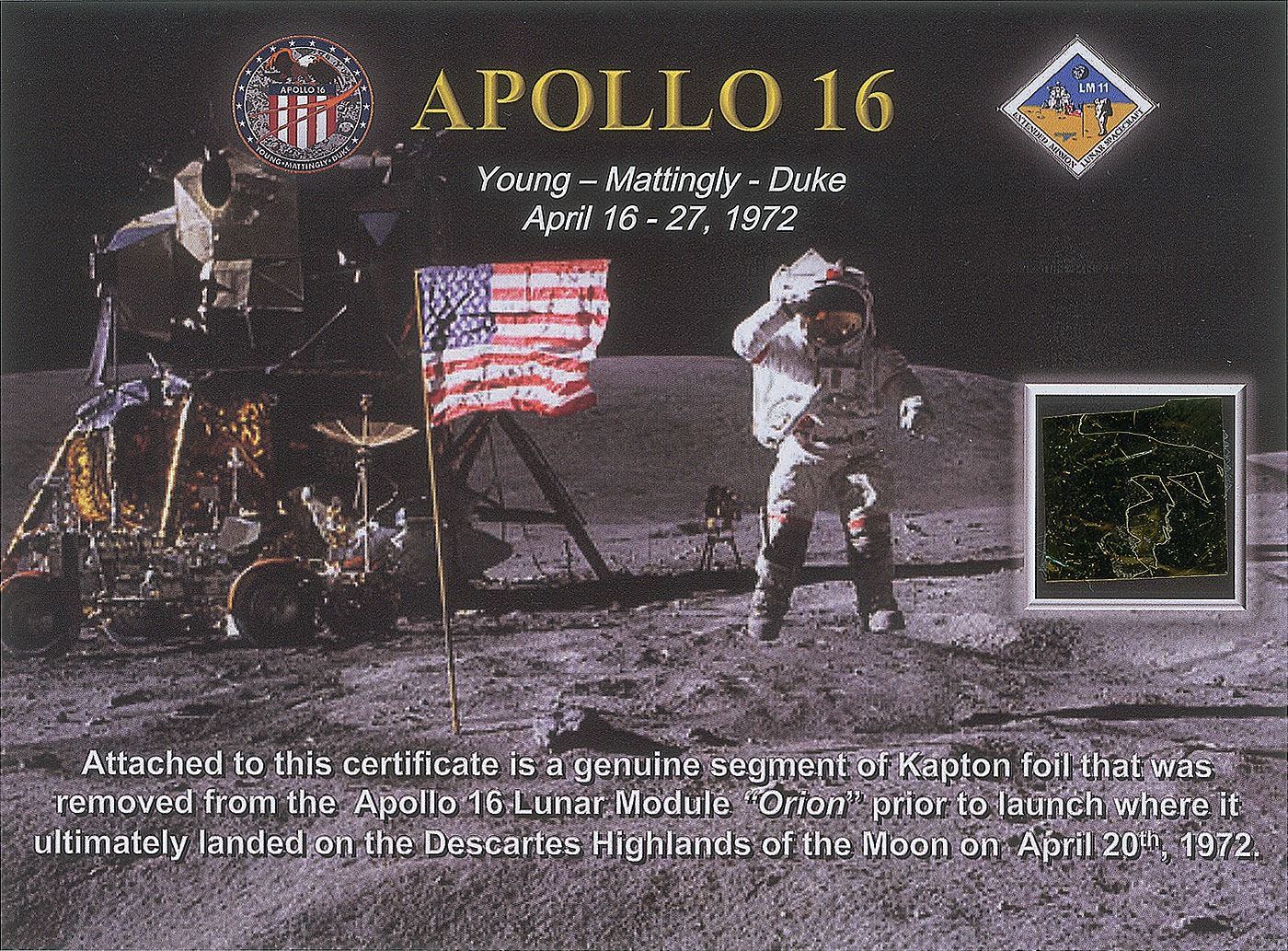 Group of three Apollo program artifact sample cards, including: a .75? length of Teflon-coated fiberglass lacing tape used in the Apollo program following the Apollo 1 fire; a 1 x 1 swatch of Kapton foil removed from the Apollo 16 LM Orion prior to launch; and a 1 x 1 swatch of Beta cloth material used in Apollo-era spacecraft and space suits. Each sample is applied to a larger informational card. In overall fine condition. Accompanied by a copy of a certificate of authenticity for the original 30´ length of Teflon-coated fiberglass lacing tape. From the collection of aerospace memorabilia specialist Ken Havekotte.