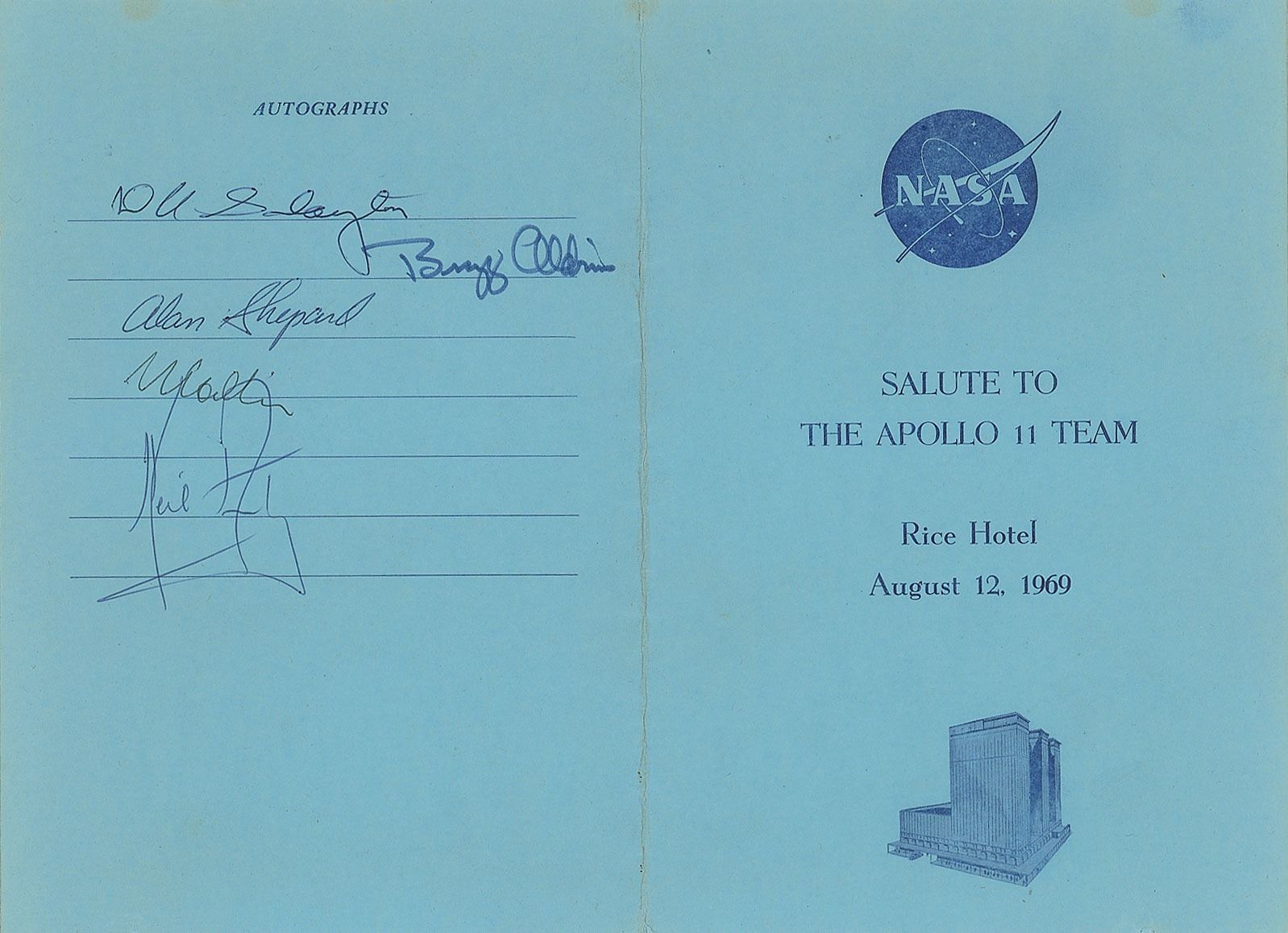 Extremely desirable program from the "Salute to the Apollo 11 Team" dinner held at the Rice Hotel in Houston, Texas, on August 12, 1969, two pages, 5.5 x 8, signed on the back cover in ballpoint, "Neil Armstrong" and "M. Collins," and in black felt tip, "Buzz Aldrin." The autograph section is also signed by first American astronaut Alan Shepard and NASA's first Chief of the Astronaut Office, Deke Slayton. In fine condition. After three weeks in confinement—in the Apollo spacecraft, on a USS Hornet trailer, and then in the Lunar Receiving Laboratory—the crew of Apollo 11 were finally allowed to leave quarantine on August 10, 1969. A day after attending this luncheon at the Rice Hotel, the crew were honored with a massive ticker-tape parade in New York City before embarking on their famous 45-day 'Giant Leap' tour. A stupendous multi-signed program featuring a uniquely significant quintet of space exploration pioneers.