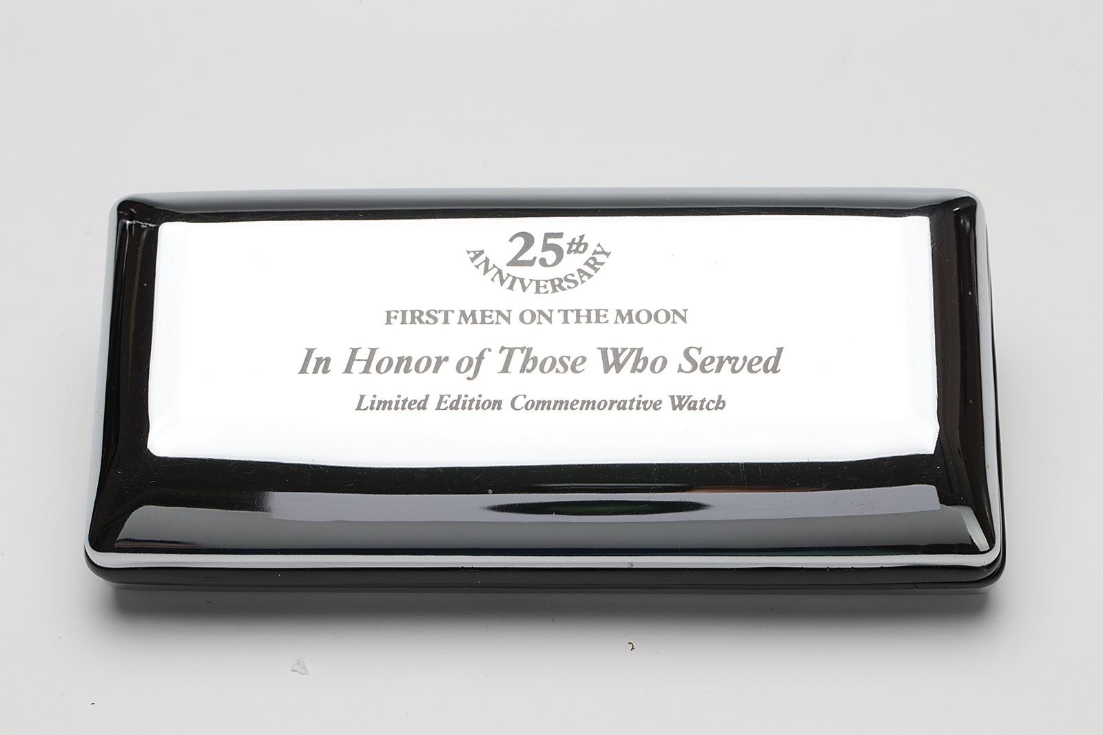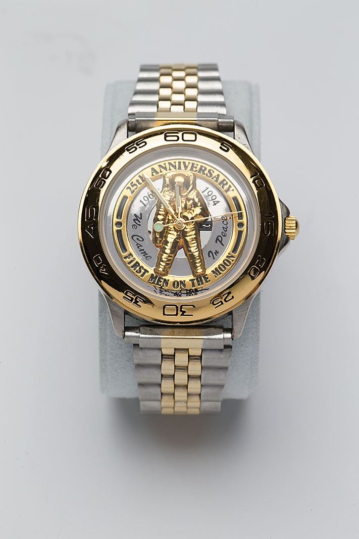 Beautiful Buzz Aldrin-authorized limited edition watch honoring the 25th anniversary of man's first step on the moon, numbered 832/25,000, produced with an alloy that incorporated flown metals from the Apollo 11 Command Module. Includes its original case with leather strap, as well as a manufacturer's certificate of authenticity and an informational packet. In fine condition.