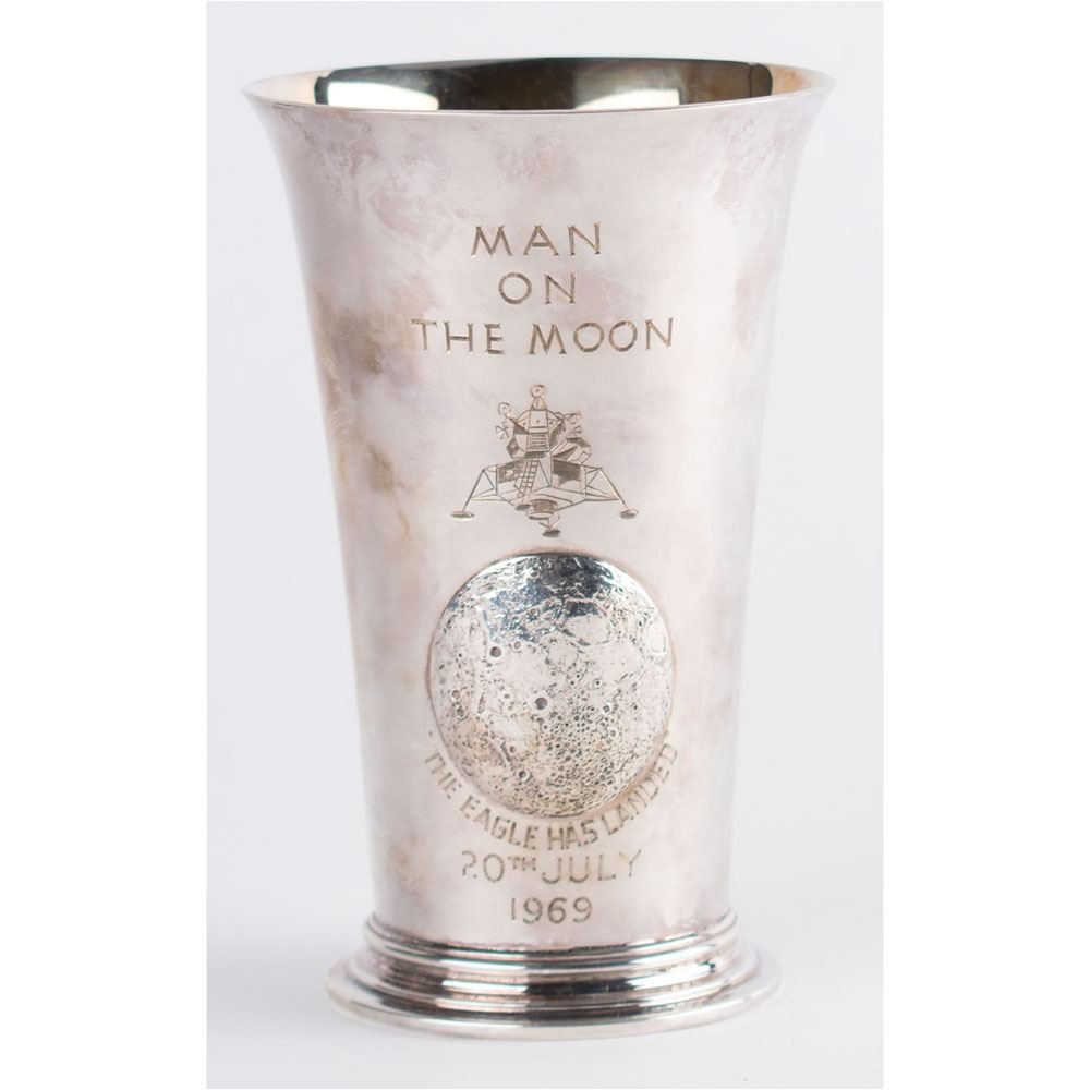 Limited edition sterling silver beaker honoring the Apollo 11 mission. Numbered 69/1500, made by Prestons Limited, 9.1 troy oz., 5.25è tall and a 3.25è mouth, with one side featuring an embossed moon, an engraved lunar module, and text: ‰ÛÏMan on the Moon, The Eagle Has Landed, 20th July 1969‰Û; and the opposite featuring an engraved NASA ‰Û÷meatball‰Ûª logo, a raised Apollo 11 mission insignia, and the astronauts‰Ûª name. Includes the original blue leather presentation case, 5.25 x 8.25 x 4.75, which is signed on the top in gold ink, ‰ÛÏMichael Collins, Apollo XI CMP.‰Û In fine condition, with some scuffing to beaker, and a scratch to case near but not affecting the autograph.