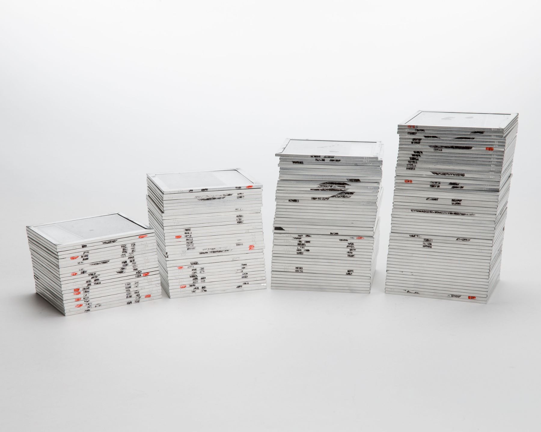 Spectacular collection of 165 color 70mm positive transparencies of images taken during the Apollo 11 mission, predominately comprising lunar surface views, interior shots of Aldrin inside the LM, lunar orbit, the spectacular Earthrise, and the LM separation sequence. The images originate from Apollo 11 film canisters 36, 37, and 44. Each transparency is numbered and sandwiched between two thin pieces of optical glass, and sealed in a 4? x 3.25? thin aluminum mount. Each slide has its own individual three-digit set of identification number etched into the outer thin edge of the mount. Slides placed in these glass and aluminum large format mounts were usually slated to be projected with the powerful, arc-source slide projector located in the Teague Auditorium at the Manned Spacecraft Center (JSC). The slides are in very good to fine condition, but show the normal discoloration and fading associated with the type of transparency film and chemical development process of that era.