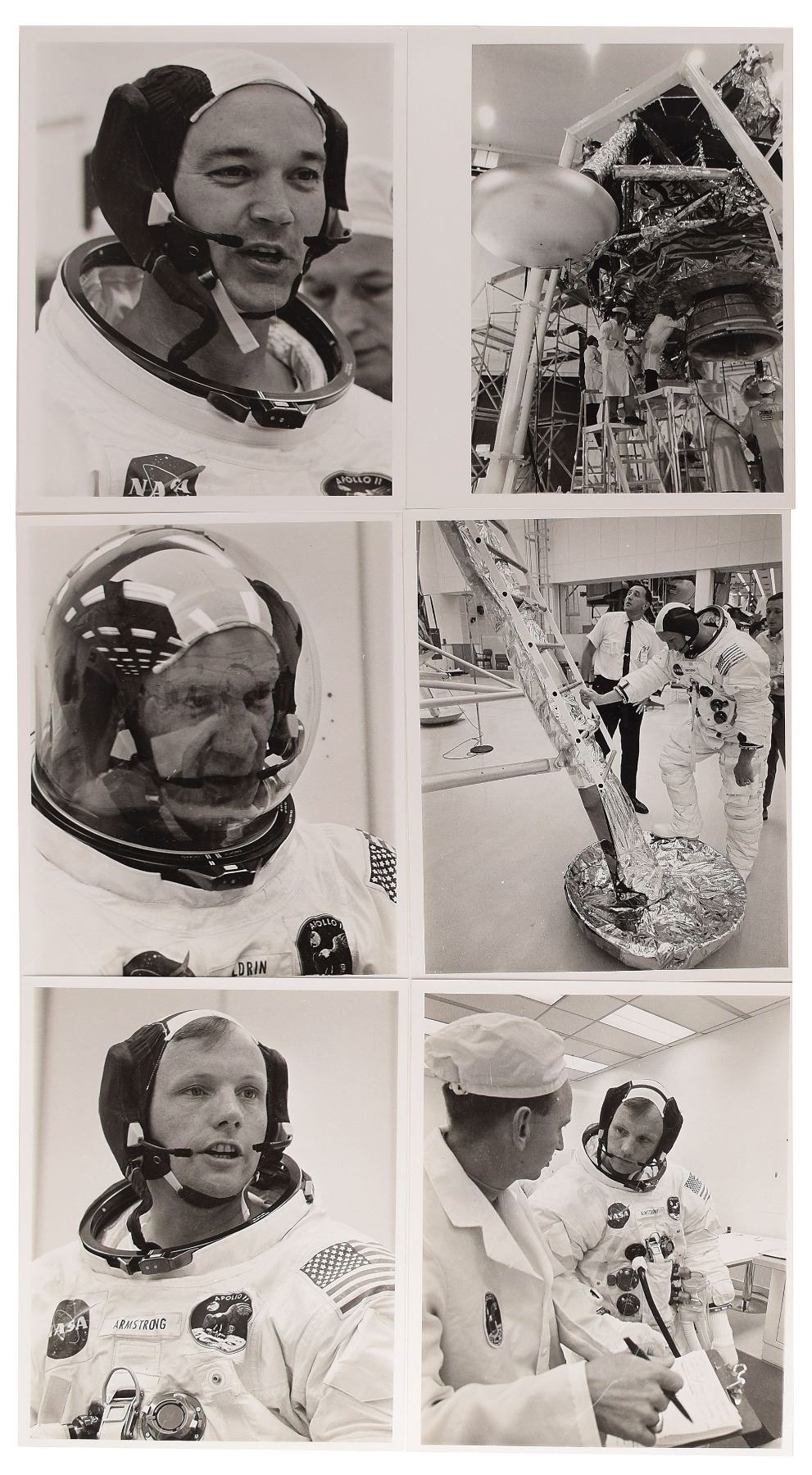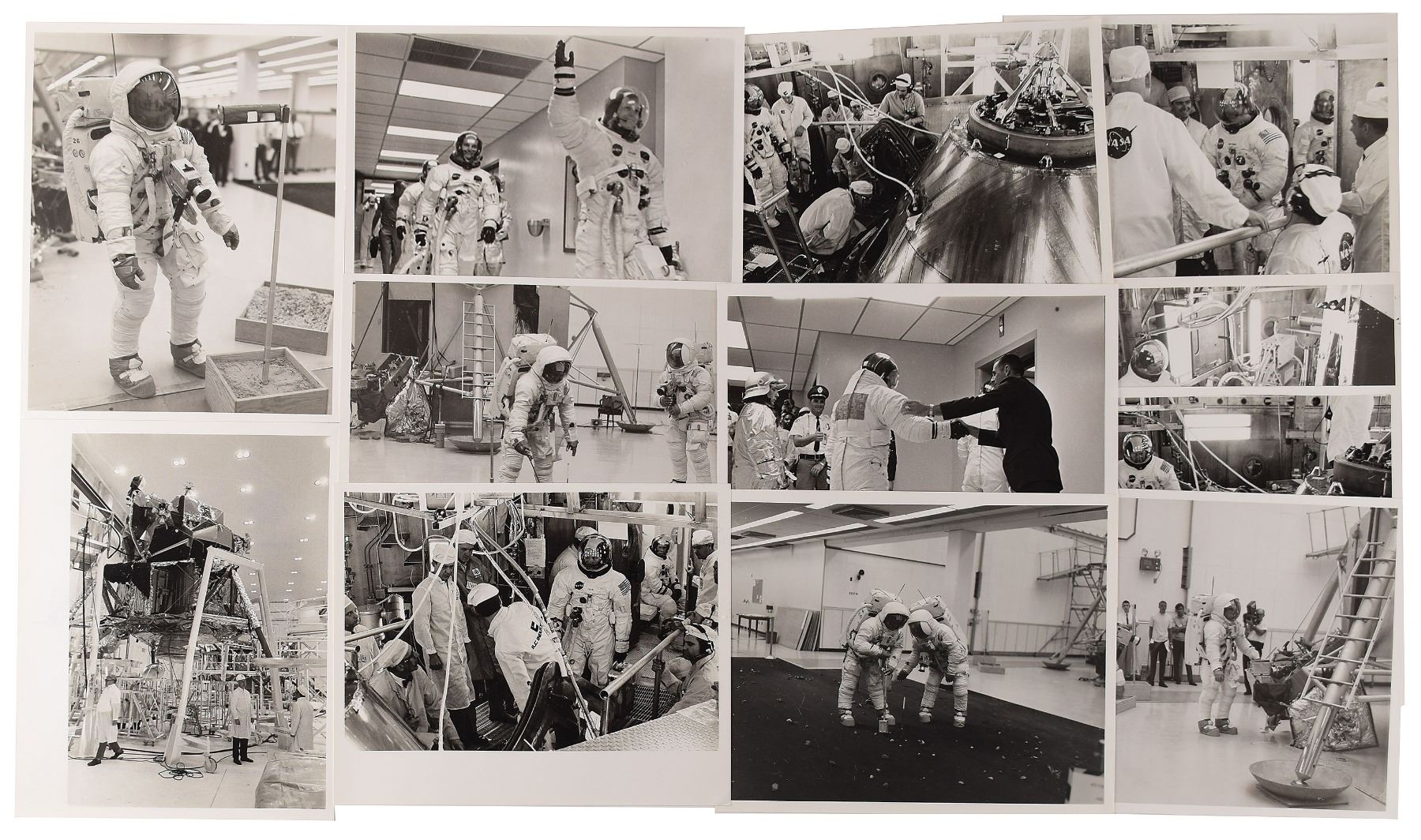 Sought-after group lot of 18 vintage original NASA photographs of the Apollo 11 crew undergoing various simulation training exercises prior to their historic lunar-landing mission, each glossy finished, 8 x 10 and 10 x 8, all bearing purple NASA caption text on the reverse. This attractive collection of Apollo 11 photos features uncommon images of Neil Armstrong, Buzz Aldrin, and Michael Armstrong as they undergo EVA training and then as the prime crew make their way to Launch Complex 39A for liftoff. In overall fine condition, with some wear to edges.