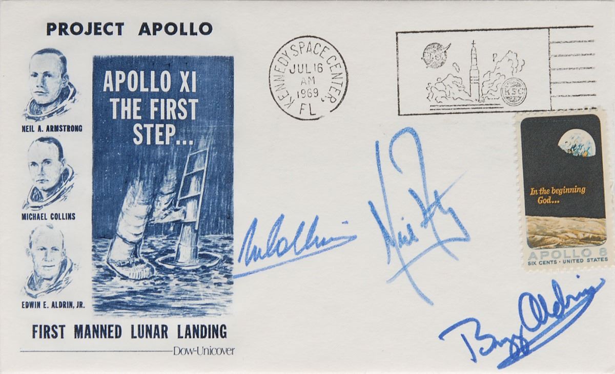 Scarce Apollo 11 ‘Type 2’ insurance Dow-Unicover cover with a cachet honoring the three crew members and the first step on the moon, bearing an August 11, 1969, Webster, Texas quarantine cancellation, signed in blue felt tip, “Neil Armstrong,” ”Buzz Aldrin,” and “M. Collins.” In fine condition. These famous insurance covers, produced immediately prior to space missions in order to provide financial security for astronauts’ families in case of disaster, have earned near-legendary status as the ultimate space-related philatelic item, with this elusive ‘Type 2’ variant considered rarer than the ‘Type 1’ examples.