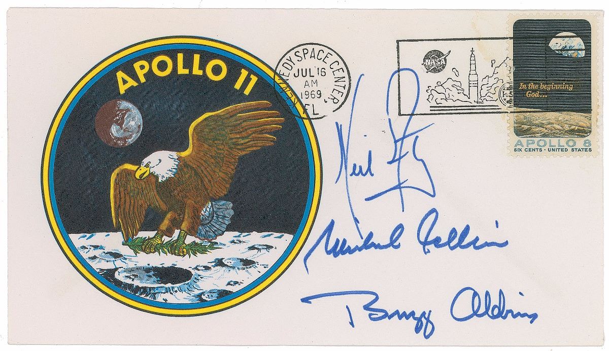 Sought-after Apollo 11 ‘Type 3’ insurance cover, 6.5 x 3.5, with a color cachet of the mission insignia and a July 16, 1969, Kennedy Space Center launch date postmark, signed in blue felt tip by Neil Armstrong, Buzz Aldrin, and Michael Collins. In fine condition. The ‘Type 3’ cover rates as the least common of the three Apollo 11 insurance covers. Produced and signed just prior to space missions in order to provide financial security for astronauts’ families in case of disaster, insurance covers are the ultimate space-related philatelic item, and one of the most sought-after formats for astronaut autographs.