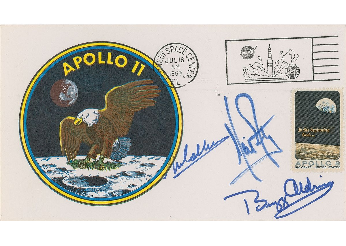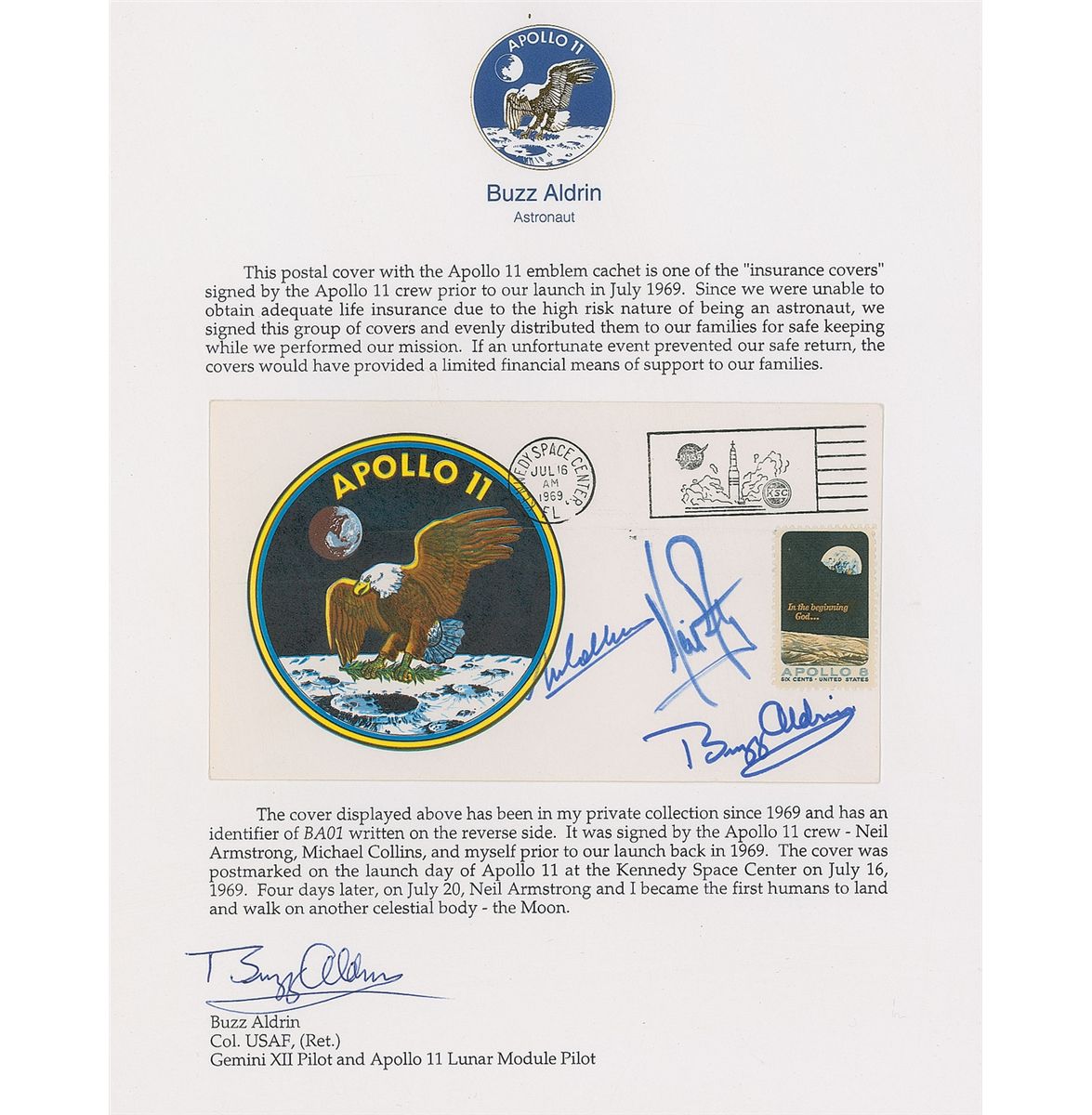 Apollo 11 'Type 3' insurance cover with a cachet of the mission insignia, bearing a July 16, 1969, Kennedy Space Center cancellation, numbered on the reverse “BA01,” signed in blue felt tip by Neil Armstrong, Buzz Aldrin, and Michael Collins. The cover is lightly affixed by three corners to a signed letter of authenticity from Buzz Aldrin on his own personal stationery which reads, in part: “This postal cover with the Apollo 11 emblem cachet is one of the ‘insurance covers’ signed by the Apollo 11 crew before our launch on July 16, 1969…The cover displayed above has been in my private collection since 1969 and has an identifier of BA01 written on the reverse side. It was signed by the Apollo 11 crew—Neil Armstrong, Michael Collins, and myself prior to launch.” In fine, bright condition. The ‘Type 3’ cover rates as the least commonly found of the three Apollo 11 insurance covers and is highly sought after by collectors; this one is further enhanced by its impeccable provenance from the second man on moon.