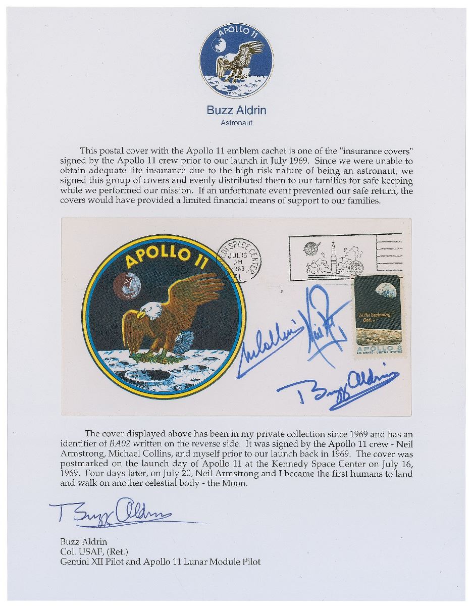Sought-after Apollo 11 ‘Type 3’ insurance cover, 6.5 x 3.5, with a color cachet of the mission insignia and a July 16, 1969, Kennedy Space Center launch date postmark, signed in blue felt tip by Neil Armstrong, Buzz Aldrin, and Michael Collins. Affixed by its corners, between descriptive paragraphs, on Dr. Aldrin’s 8.5 x 11 personal Apollo 11 stationery. Signed at the conclusion in blue ballpoint by Aldrin, the presentation reads, in part: “The cover displayed above has been in my private collection since 1969 and has an identifier of BA02 written on the reverse side. It was signed by the Apollo 11 crew…prior to our launch in 1969.” In fine condition. The ‘Type 3’ cover rates as the least common of the three Apollo 11 insurance covers and is highly desired by collectors. A wonderfully crisp example originating from the personal collection of the second man to walk on the moon.