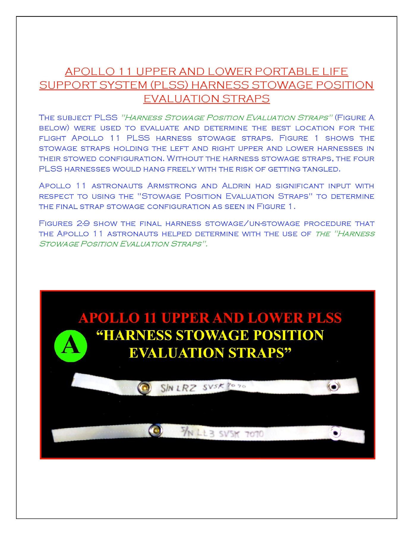 Scarce pair of Evaluation Stowage Straps used to determine the best position for the flight Apollo 11 Portable Life Support System (PLSS) harnesses. Both straps are constructed of durable off-white Beta cloth, with one measuring 12.25 x .5, and the other 11.5 x .5, with both featuring male and female snaps at opposite ends; the longer strap is marked in black felt tip, “S/N LL3 SVSK 7070,” and the other is marked: “S/N LRZ SVSK 7070.” The stowage straps were designed to hold the left and right upper and lower harnesses in their stowed configuration. Without the harness stowage straps, the four PLSS harnesses would hang freely with the risk of getting tangled. Apollo 11 astronauts Neil Armstrong and Buzz Aldrin had significant input in the final configuration of the stowage straps. In overall fine condition.