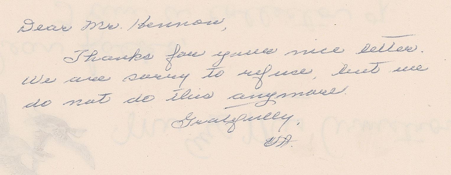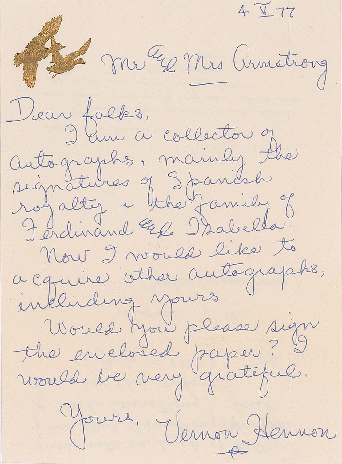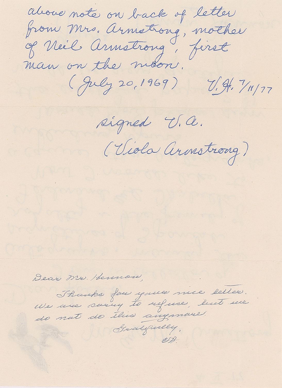 ANS from Neil Armstrong's mother Viola Engel Armstrong, signed with her initials, “V. A.,” penned on the reverse of a fan letter requesting her son's autograph, one page, 6.75 x 9, dated May 4, 1977. Viola's note, in full: "Thanks for your nice letter. We are sorry to refuse, but we do not do this anymore." In fine condition.