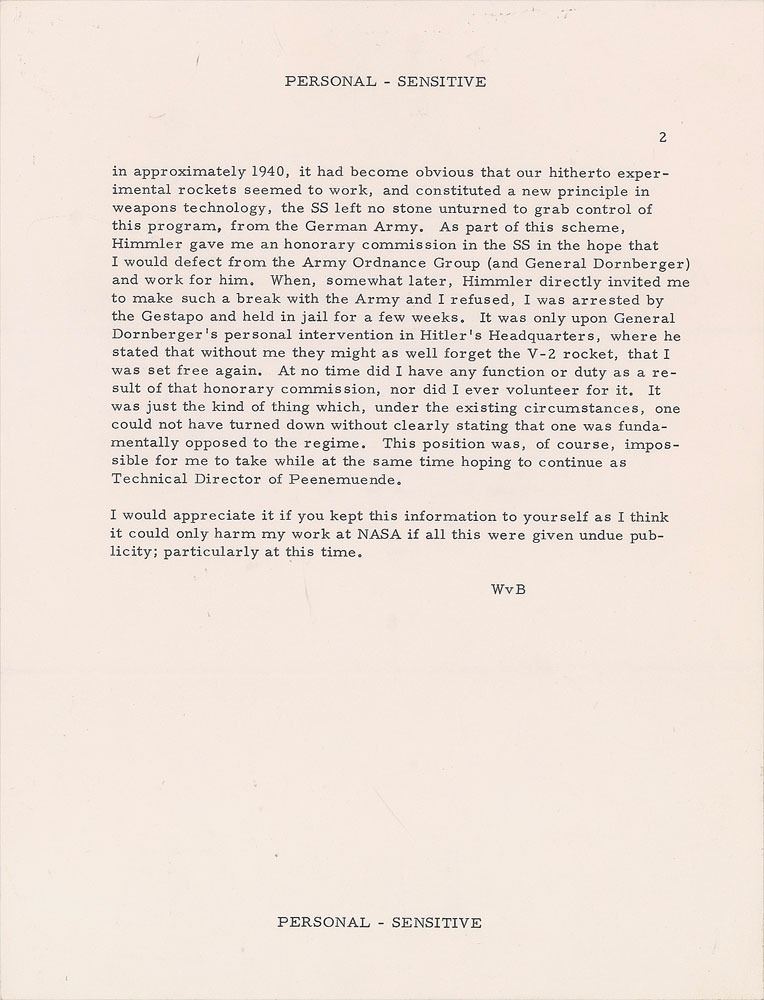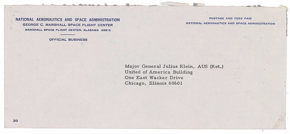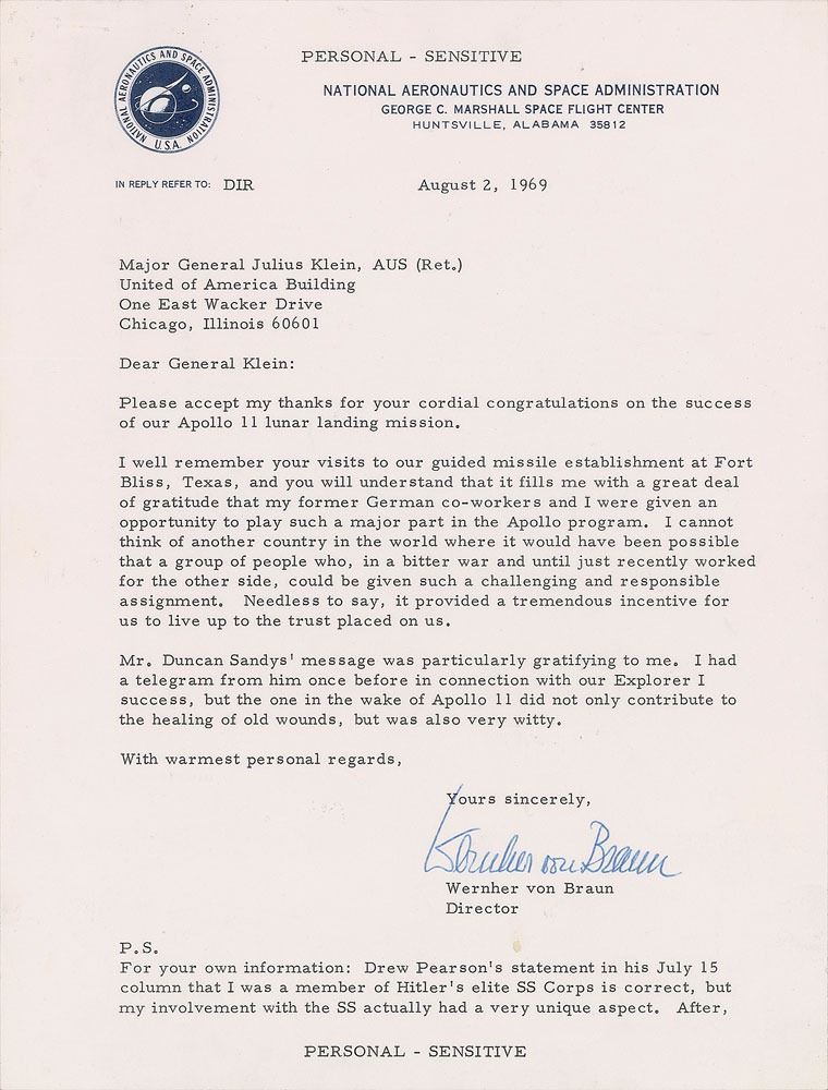 TLS, two pages, 8 x 10.5, NASA letterhead, August 2, 1969. Letter to Major General Julius Klein, in part: "Please accept my thanks for your cordial congratulations on the success of our Apollo 11 lunar landing mission. I well remember your visits to our guided missile establishment at Fort Bliss, Texas, and you will understand that it fills me with a great deal of gratitude that my former German co-workers and I were given an opportunity to play such a major part in the Apollo program. I cannot think of another country in the world where it would have been possible that a group of people who, in a bitter war and until just recently worked for the other side, could be given such a challenging and responsible assignment. Needless to say, it provided a tremendous incentive for us to live up to the trust placed on us." In a lengthy postscript, he adds: "Drew Pearson's statement in his July 15 [sic] column that I was a member of Hitler's elite SS Corps is correct, but my involvement with the SS actually had a very unique aspect. After, in approximately 1940, it had become obvious that our hitherto experimental rockets seemed to work, and constituted a new principle in weapons technology, the SS left no stone unturned to grab control of this program, from the German Army. As part of this scheme, Himmler gave me an honorary commission in the SS in the hope that I would defect from the Army Ordnance Group…When, somewhat later, Himmler directly invited me to make such a break with the Army and I refused, I was arrested by the Gestapo and held in jail for a few weeks. It was only upon General Dornberger's personal intervention in Hitler's Headquarters, where he stated that without me they might as well forget the V-2 rocket, that I was set free again. At no time did I have any function or duty as a result of that honorary commission…It was just the kind of thing which, under the existing circumstances, one could not have turned down without clearly stating that one was fundamentally opposed to the regime. This position was, of course, impossible for me to take while at the same time hoping to continue as Technical Director of Peenemuende. I would appreciate it if you kept this information to yourself as I think it could only harm my work at NASA if this were given undue publicity; particularly at this time." In fine condition. Accompanied by the original mailing envelope. The recipient of this letter, Julius Klein, had served as an American spy in Germany during World War I, and was stationed in the Pacific Theater during World War II. He also helped ameliorate both German-American and German-Israel relations after World War II.