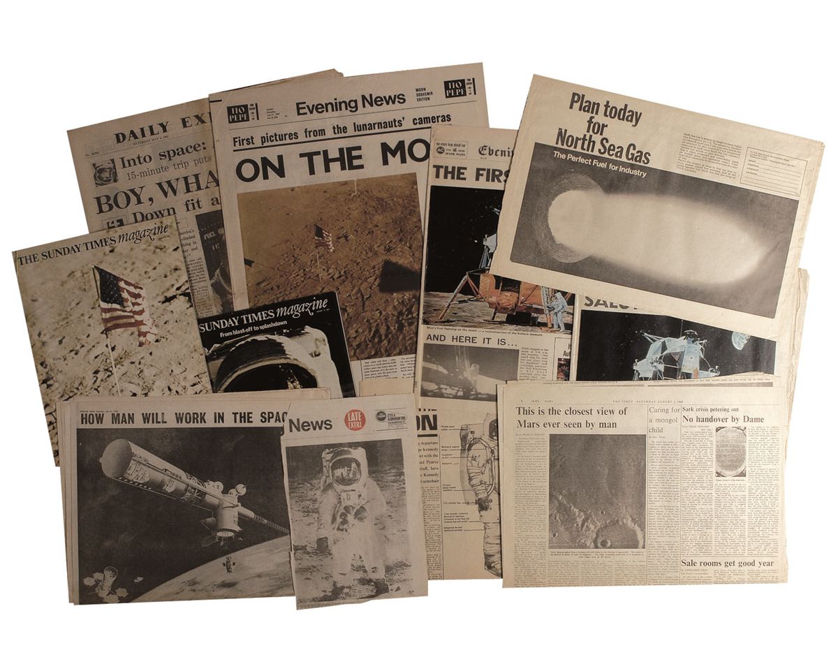 Collection of ten items from the early days of America’s excursion into space, as reported by the British press. Items are: copy of the Daily Express, May 6, 1961, detailing Alan Shepard’s flight; seven newspapers or newspaper clippings regarding preparation for the Apollo 11 mission as well as the landing; and two Sunday newspaper magazine sections with coverage of the Apollo 11 landing. In very good condition with mild to moderate toning. Rolled.