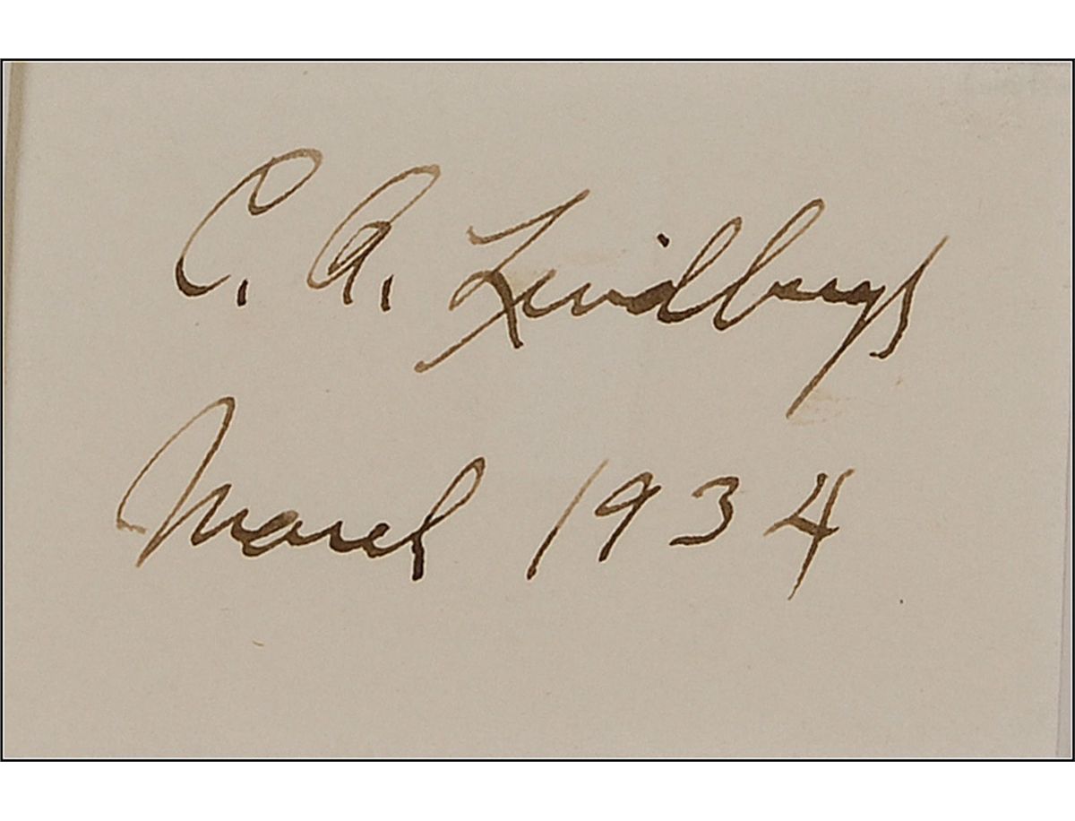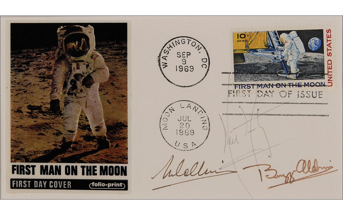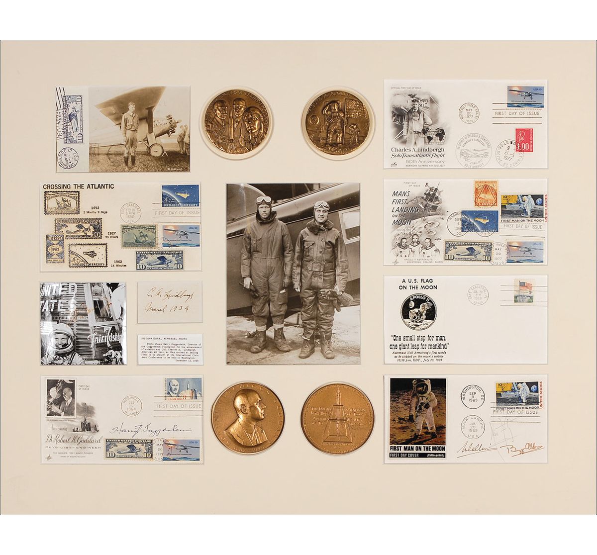An exceptional display featuring signed items from Charles Lindbergh, the Apollo 11 crew, and John Glenn. Items include: Ink signature, “C. A. Lindbergh, March 1934,” on an off-white slip; a 1969 FDC with an affixed cachet honoring the first man on the moon, signed in ink and felt tip by Neil Armstrong, Buzz Aldrin, and Michael Collins; a clipped 3.25 x 3 glossy photo of Glenn posing in front of his Mercury capsule, signed in brown ink, “J. H. Glenn, Jr.”; and an FDC with a cachet honoring Robert Goddard, signed in ballpoint by Harry Guggenheim. Other items include an unsigned vintage 5.25 x 7 photo picturing Lindbergh and Guggenheim, as they arrived at Bolling Field in Washington, D.C., December 12, 1928; a reproduction postcard photo of Lindbergh posing with The Spirit of St. Louis; four other FDCs, and four commemorative medallions. All the items are matted together to an overall size of 23.5 X 19.25. Armstrong’s signature a shade light, moderate contrast to Glenn’s light, but mostly legible signature, and a few light vertical cuts to three of the unsigned covers, otherwise fine condition.