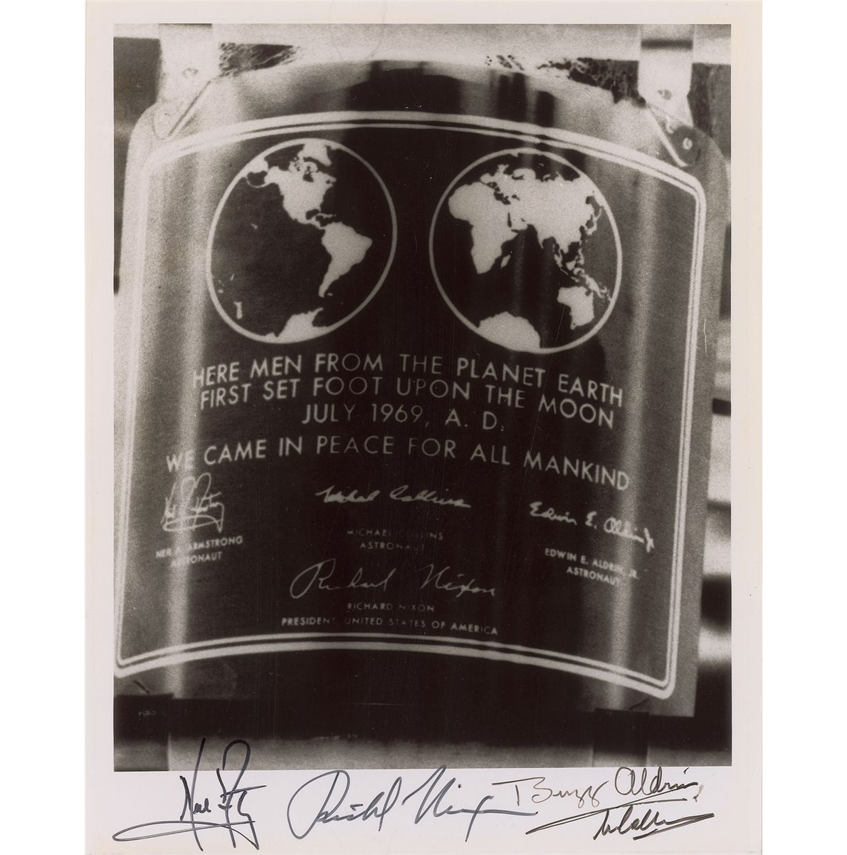 Rare and extraordinary glossy 7.75 x 9.75 photo of the famous lunar plaque left behind on the moon’s surface, reading, “Here men from the planet Earth first set foot upon the Moon / July 1969 A. D. / We came in peace for all mankind,” signed in black felt tip by Neil Armstrong, Buzz Aldrin, Michael Collins, and Richard Nixon. In fine condition, with an unobtrusive irregular surface spot at the top edge. An amazing piece with the rarely seen combination of the full Apollo 11 crew as well as the president of the United States, and one of the most iconic images of the Apollo era.