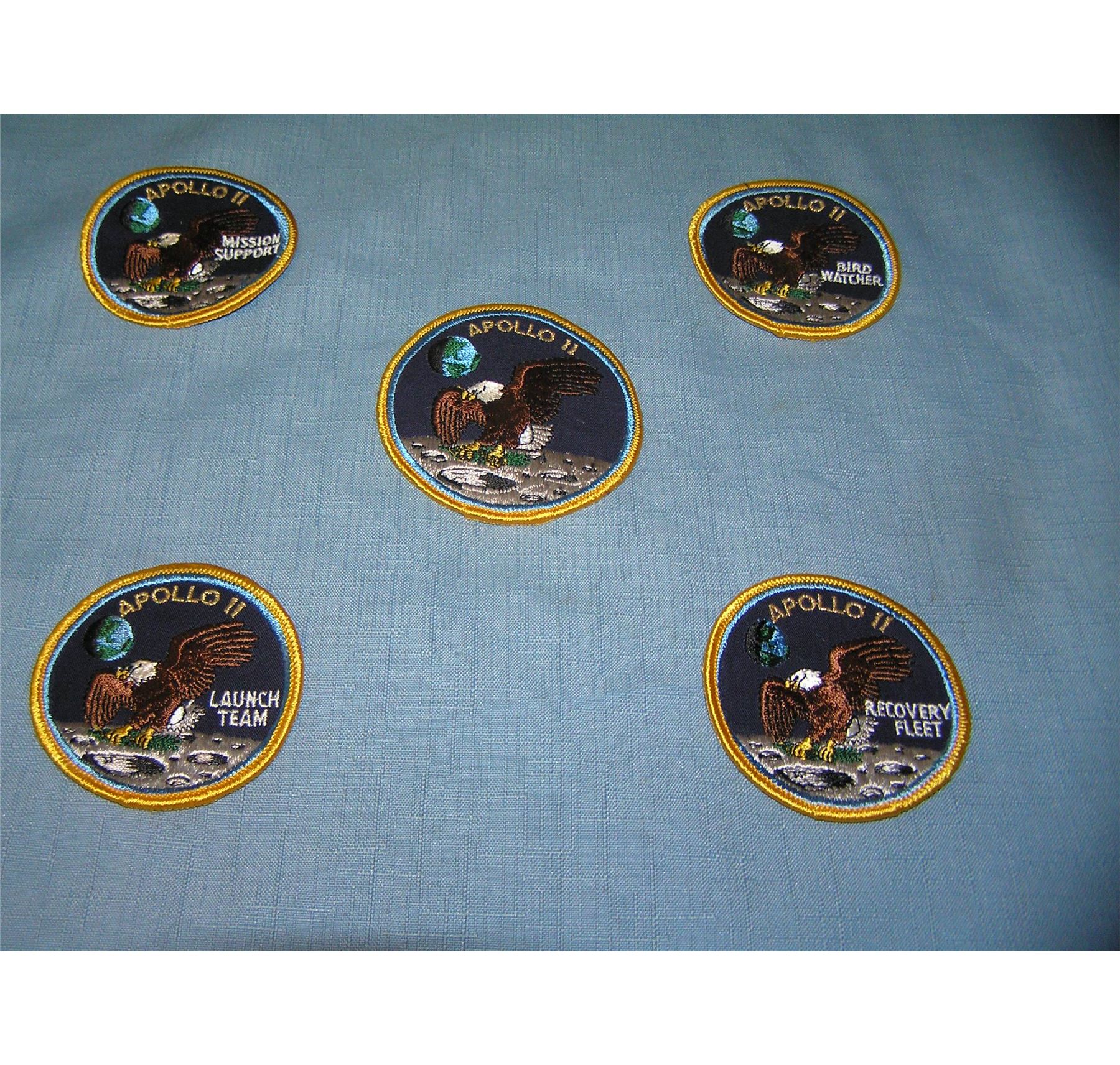 Complete collection of five rare hand embroidered Apollo 11 first man on the moon patches, this mint never used set is complete in original bag, scarce est. value $65.00-$70.00