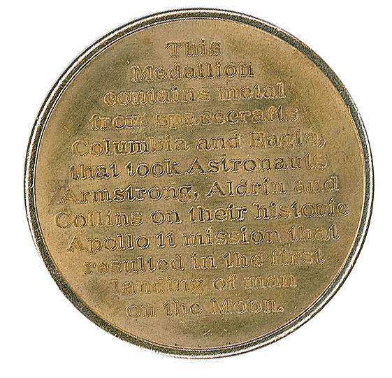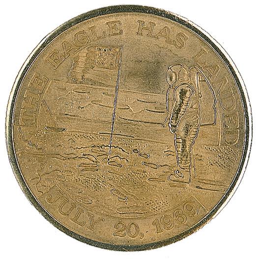 Rare gold-colored Apollo 11 Manned Flight Awareness medal, 1.25” diameter. The face bears the raised re-creation of the famous image of Buzz Aldrin looking at the American flag on the lunar surface; the reverse is engraved, “This Medallion contains metal from spacecrafts Columbia and Eagle, that took Astronauts Armstrong, Aldrin and Collins on their historic Apollo 11 mission that resulted in the first landing of man on the Moon.” These were awarded by NASA to important people involved in the space program, with this item originating from Aldrin’s personal collection. Normal condition. A scarce and desirable artifact commemorating—and made from—a piece of history!