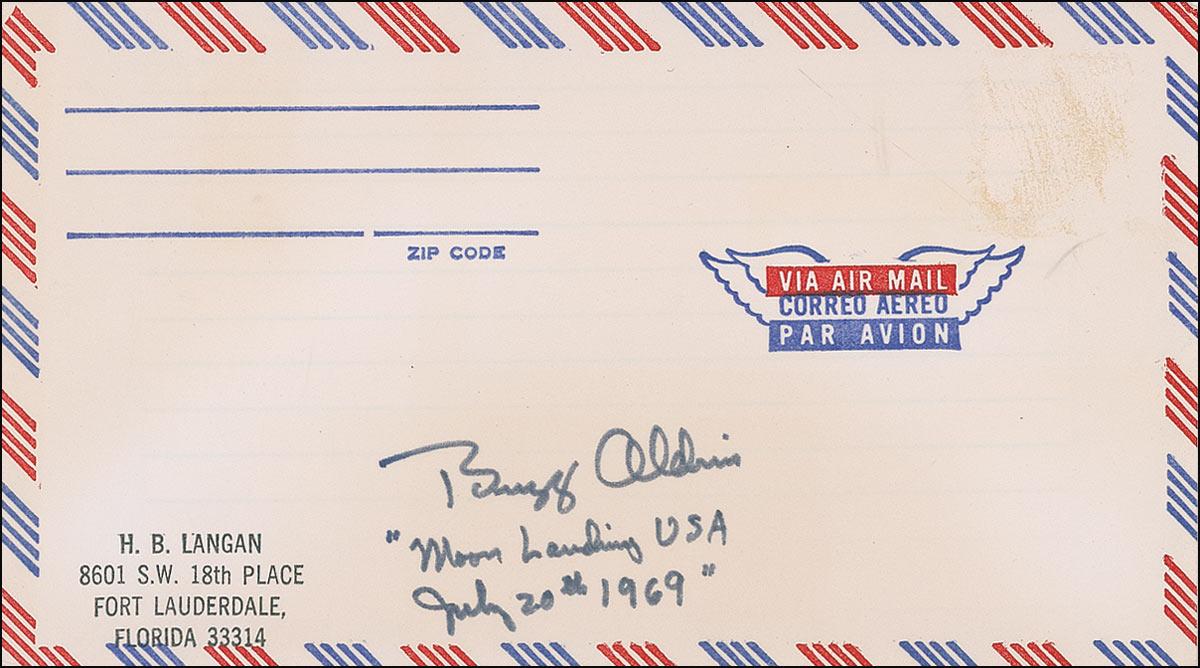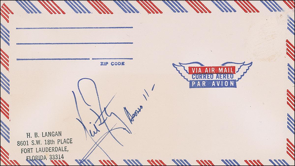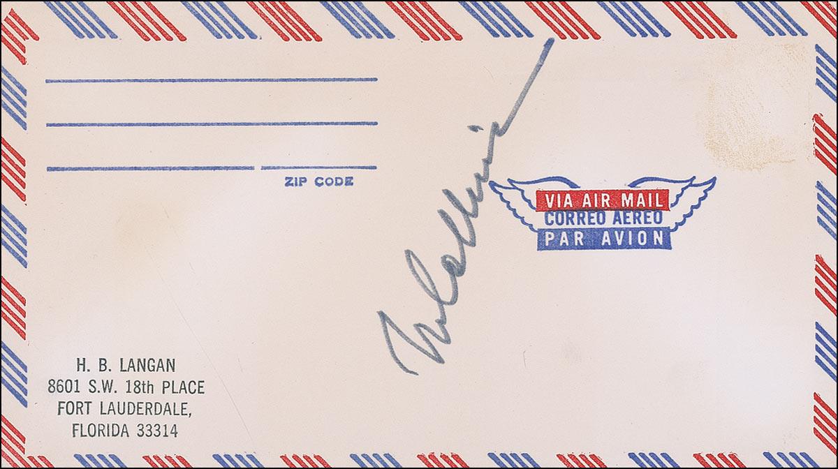 Three identical airmail envelopes, each 6.5 x 3.75, one signed in blue felt tip “Neil Armstrong, Apollo 11,” one signed in black felt tip, “Buzz Aldrin, ‘Moon Landing USA, July 20th 1969,’’’ and one signed in black felt tip by Michael Collins. Each envelope also bears a small Fort Lauderdale address stamp to lower left. In fine condition, with some scattered toning to all three envelopes, and light adhesive residue from removal of postage stamps. A colorful and unique collection of this coveted trio of astronauts, with Armstrong's desirable addition of “Apollo 11.”