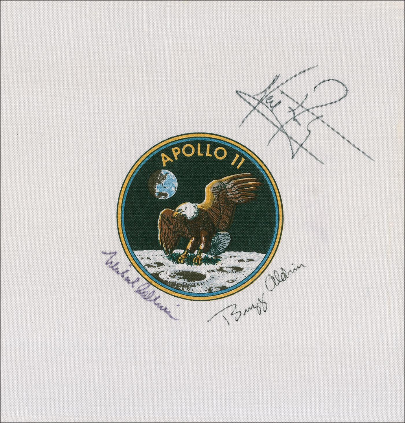 An 8.25 x 8.75 swatch of Beta cloth, bearing a printed 3.5-inch diameter Apollo 11 mission emblem, signed around the emblem in black felt tip by crew members Neil Armstrong, Buzz Aldrin, and Michael Collins. In fine condition, with a bit of light feathering and skipping to portions of signatures due to nature of material, light horizontal and vertical fold, and some mild edge toning from adhesive remnants on reverse. Beta cloth is a type of fireproof woven fiber cloth used in the manufacturing of the space suit. Designed by Frederick S. Dawn, a scientist who worked with the Dow-Corning Company, the fabric was made to withstand temperatures exceeding 650°C and was used in all NASA space suits following the deadly launchpad fire of Apollo 1. An outstanding relic from this most historic and avidly collected of Apollo missions.