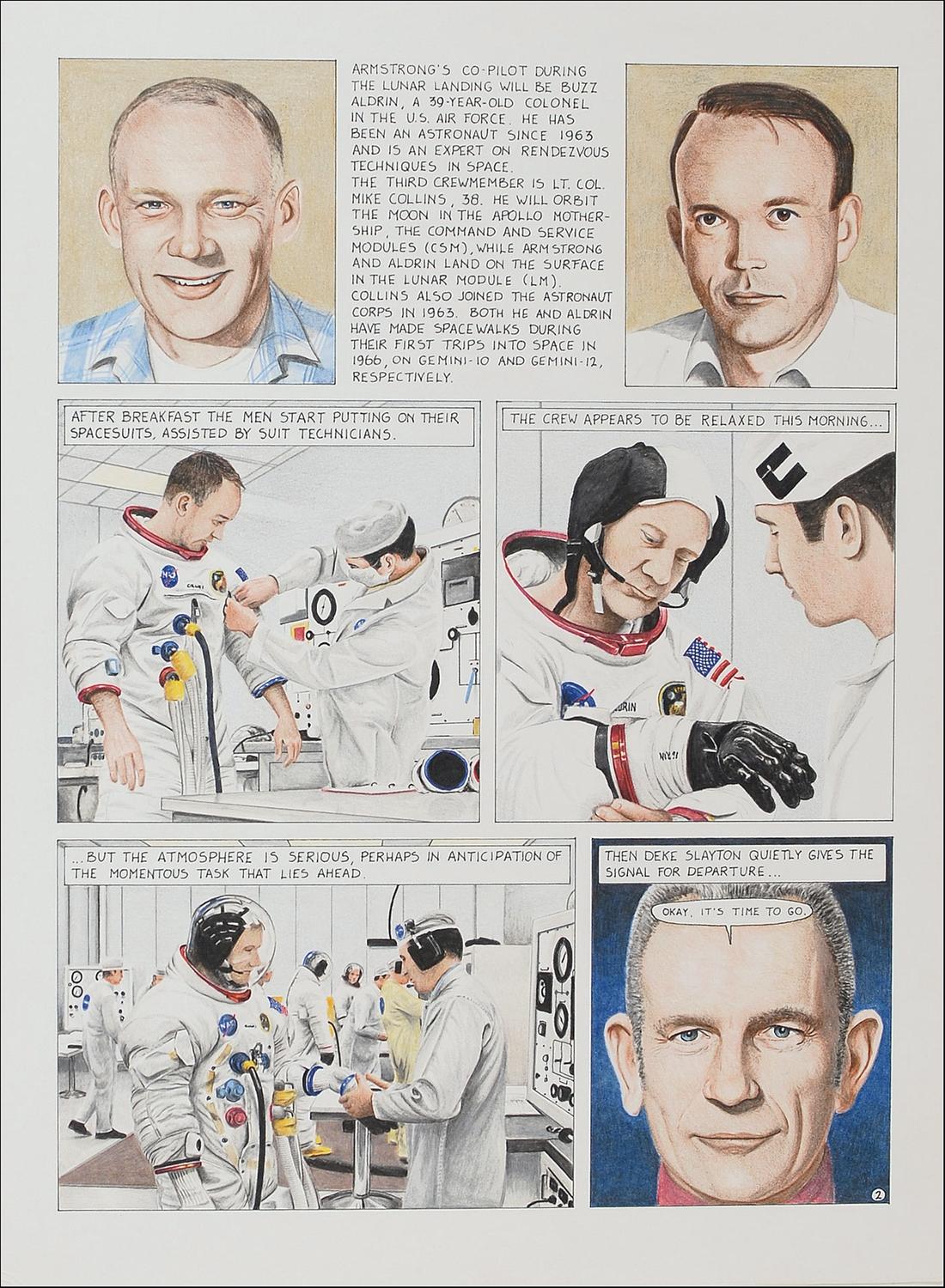 Original unsigned hand-inked five-panel comic page by noted space artist Ed Hengeveld. The page measures 11.75 x 15.75, and is the second page of larger comic. Top panel shows Aldrin and Collins and provides a bit of background information about the crew members, following three panels show the crew getting ready for their flight, with final panel showing Deke Slayton giving the signal for departure. In fine condition. Hengevel’s paintings have been published in various magazines around the world and several astronauts own portraits of themselves, painted by Hengeveld.