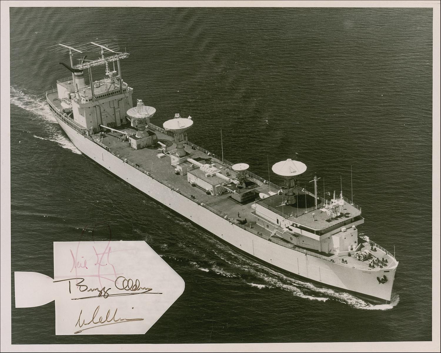 Glossy 10 x 8 photo of the USNS Redstone, signed in black ink in a white silhouette of the Apollo 11 capsule integral to the image at lower left, “Neil Armstrong,” “Buzz Aldrin,” and “M. Collins.” Accompanied by a notarized letter of provenance from the original owner, who explains that he was a contract employee on the Redstone from 1967 to 1969, and that he specially prepared the photo and obtained the signatures through NASA. A few dings, surface marks, and light creases (one just touching top of Armstrong’s “A”), and slight fading to Armstrong’s signature (which remains clear and well contrasted against the white background; tops of initials against darker background), otherwise fine condition. The Redstone was one of the seagoing tracking ships used on all the Apollo missions. A rare and unique example for the Apollo completist!