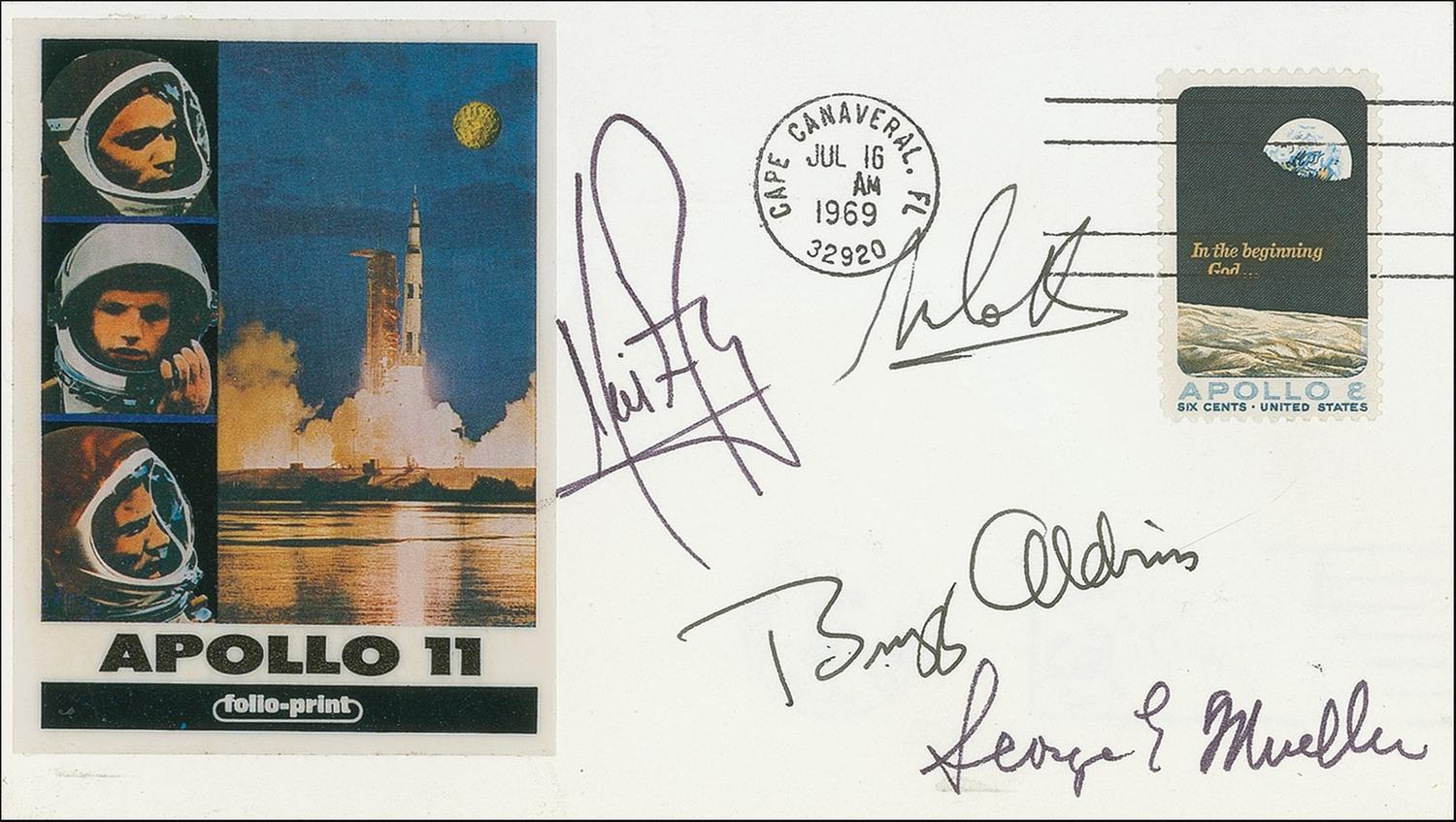 Commemorative cover with an affixed color cachet honoring the Apollo 11 mission and crew, signed in black felt tip by Neil Armstrong, Buzz Aldrin, and Michael Collins, and also signed by NASA manager George E. Mueller. In fine condition. Uncommon in this form as the Apollo 11 crew have long refused to sign any type of covers.