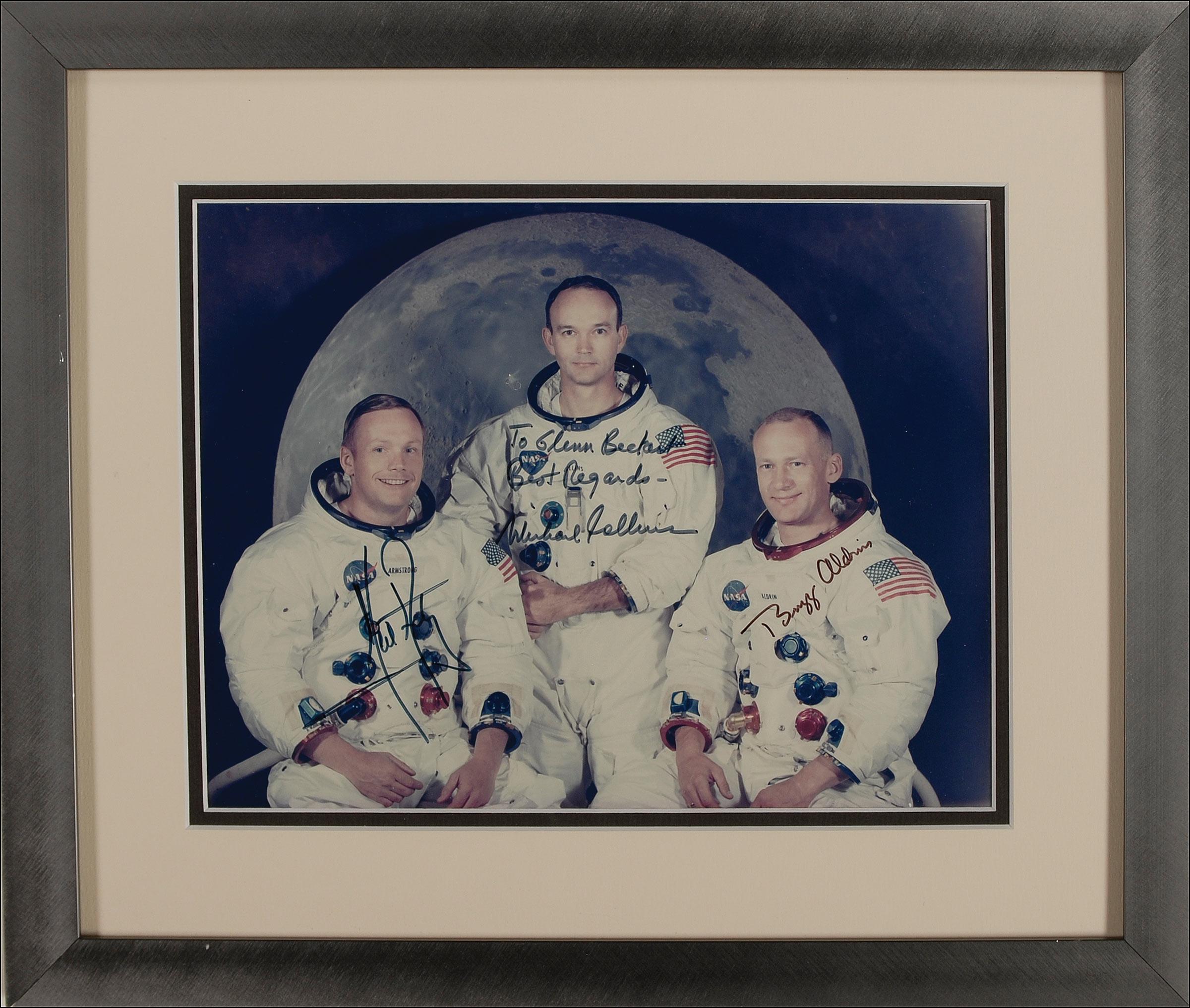 Vintage red-numbered color glossy 10 x 8 photo of the Apollo 11 crew members posing together in their spacesuits in front of a lunar background, presenting vintage signatures from the time of the Apollo 11 mission. The glossy is signed and inscribed in black felt tip “To Glenn Beckart, Best regards–Michael Collins,” and signed “Neil Armstrong,” and “Buzz Aldrin.” Double matted and framed to an overall size of 14 x 12, although the photo is easily able to be removed from the frame and displayed as a standalone glossy. In fine condition, with a shade of minor fading to image, and a small surface indentation to left of Collins’s face. A rare vintage glossy example of the most coveted of Apollo missions.