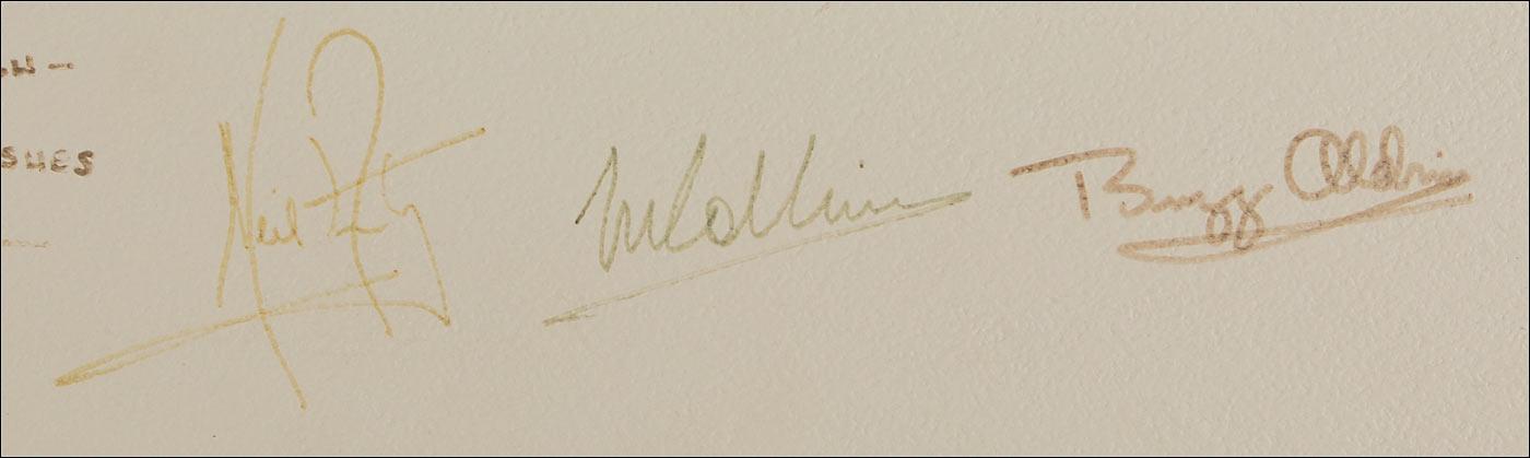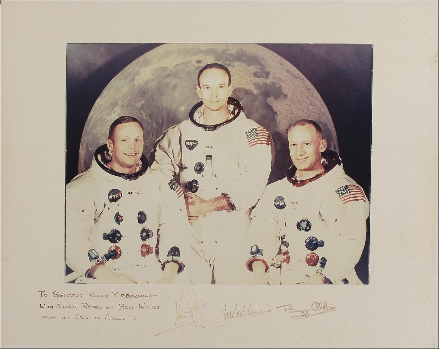 Color glossy 14 x 11 photo of the Apollo 11 crew posing together in their space suits, and affixed to a 20 x 16 mount, signed and inscribed in black felt tip by Armstrong “To Senator Ralph Yarborough—With sincere respect and best wishes from the crew of Apollo 11—Neil Armstrong,” then signed by both “Mike Collins” and “Buzz Aldrin.” In very good to fine condition, with light overall fading to both the image and handwriting (most likely from previous display), some light surface marks and streaking to emulsion of image, mild toning to mount, a couple light creases, and a paperclip impression to lower left corner of image. Also, given the disparity in darkness between the inscription and Armstrong’s signature, it appears that the inscription may have been tastefully traced over in another hand. Oversized portraits signed by Apollo 11 crew members are highly sought after by collectors.