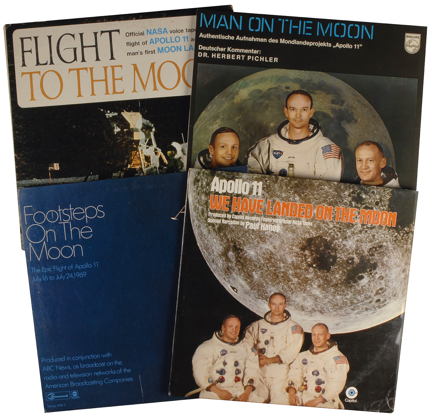 Four Apollo 11-related LP albums: Man on the Moon (in German); Flight to the Moon; Apollo 11: We Have Landed on the Moon; and Footsteps on the Moon: The Epic Flight of Apollo 11. In fine condition, with expected cover wear and rubbing, scattered creases, and a few edge separations.