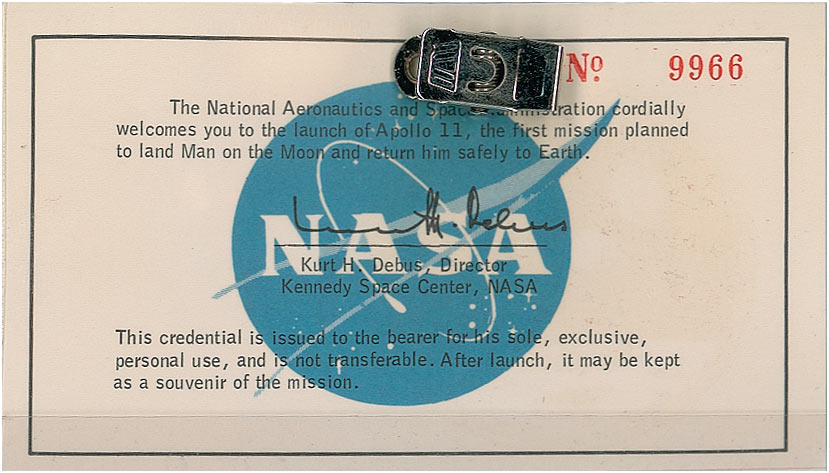 Access badge, 5 x 3, number 9966, issued to an unnamed recipient as an invitation to the launch of Apollo 11. The front of the badge includes the Apollo 11 mission emblem and lunar landscape; the reverse bears the NASA logo and reads: “The National Aeronautics and Space Administration cordially welcomes you to the launch of Apollo 11, the first mission planned to land Man on the Moon and return him safely to Earth. This credential is issued to the bearer for his sole, exclusive, personal use, and is not transferable. After launch, it may be kept as a souvenir of the mission.” Light rippling with a metal fastener affixed to the reverse of a removable plastic sleeve.
