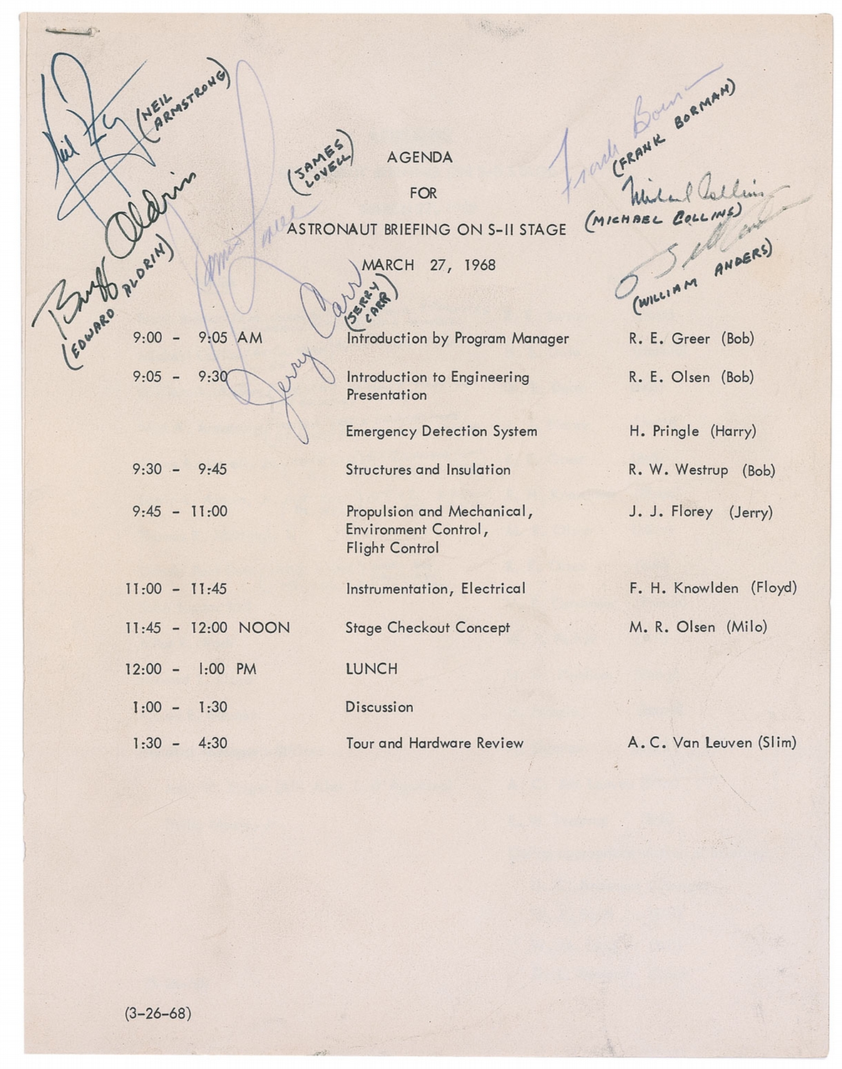 DS, two pages, 8.5 x 11, March 27, 1968. A printed “Agenda for Astronaut Briefing on S-II Stage,” signed in various inks on the first page by Neil Armstrong, Michael Collins, Buzz Aldrin, James Lovell, Frank Borman, Bill Anders, and Jerry Carr. Each astronaut’s signature has been identified in another hand; the second page also bears several descriptive notations, evidently made at the time of the briefing. Light soiling and handling wear (including staple holes), creases to lower right blank area, notations as noted, and slightly irregular ink flow to Anders’s signature, otherwise fine condition.