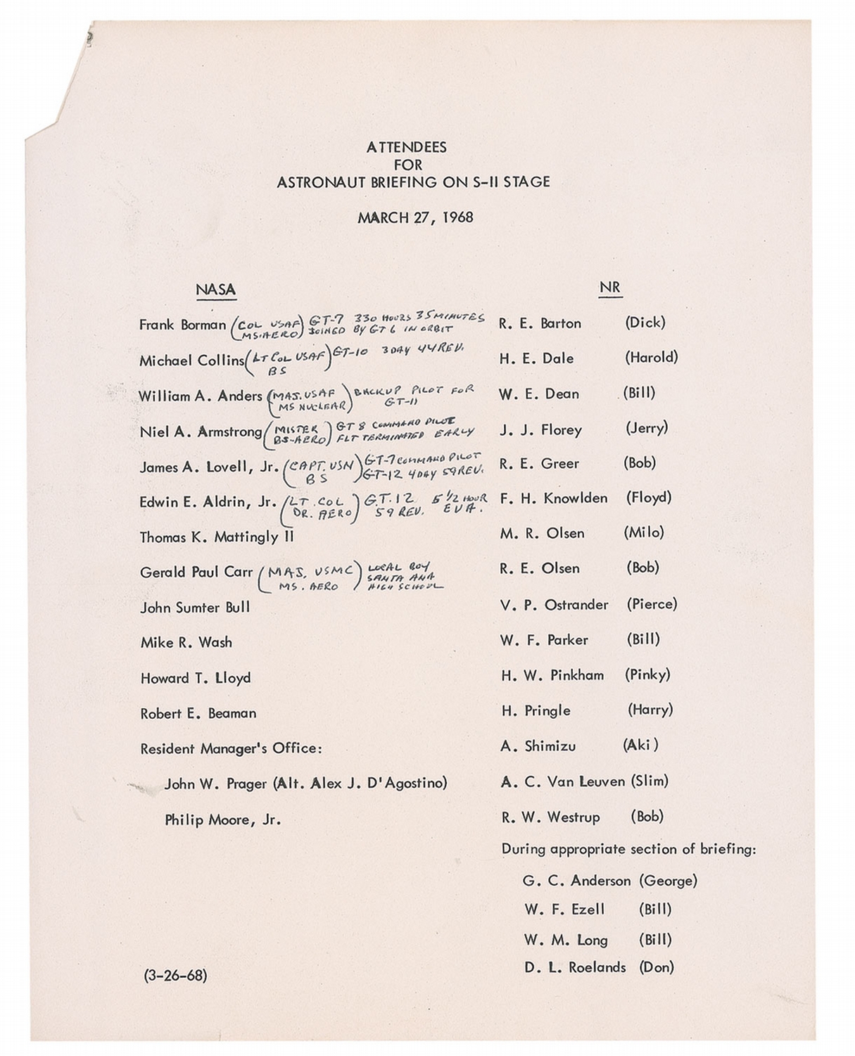 On this day, the astronauts were briefed on the status of the S-II, the second stage of the Saturn V rocket built by North American Aviation. The topics included the emergency detection system, structures and insulation, propulsion and mechanical systems, as well as instrumentation and electrical systems. Among those in attendance—the complete crews of Apollo 8 and Apollo 11—including Neil Armstrong. Each astronaut would eventually rely on the S-II, which used liquid oxygen and liquid hydrogen, to propel them through the upper atmosphere. Based on the date of this document, this agenda specifically referred to S-II-2, which carried cameras to record first stage separation and identify any potential problems, with enhanced versions of the same system used throughout Apollo. The dangers of space flight and aviation was brought home to the astronauts on the same date as this document, as it was the same day cosmonaut Yuri Gagarin was killed in a training accident.