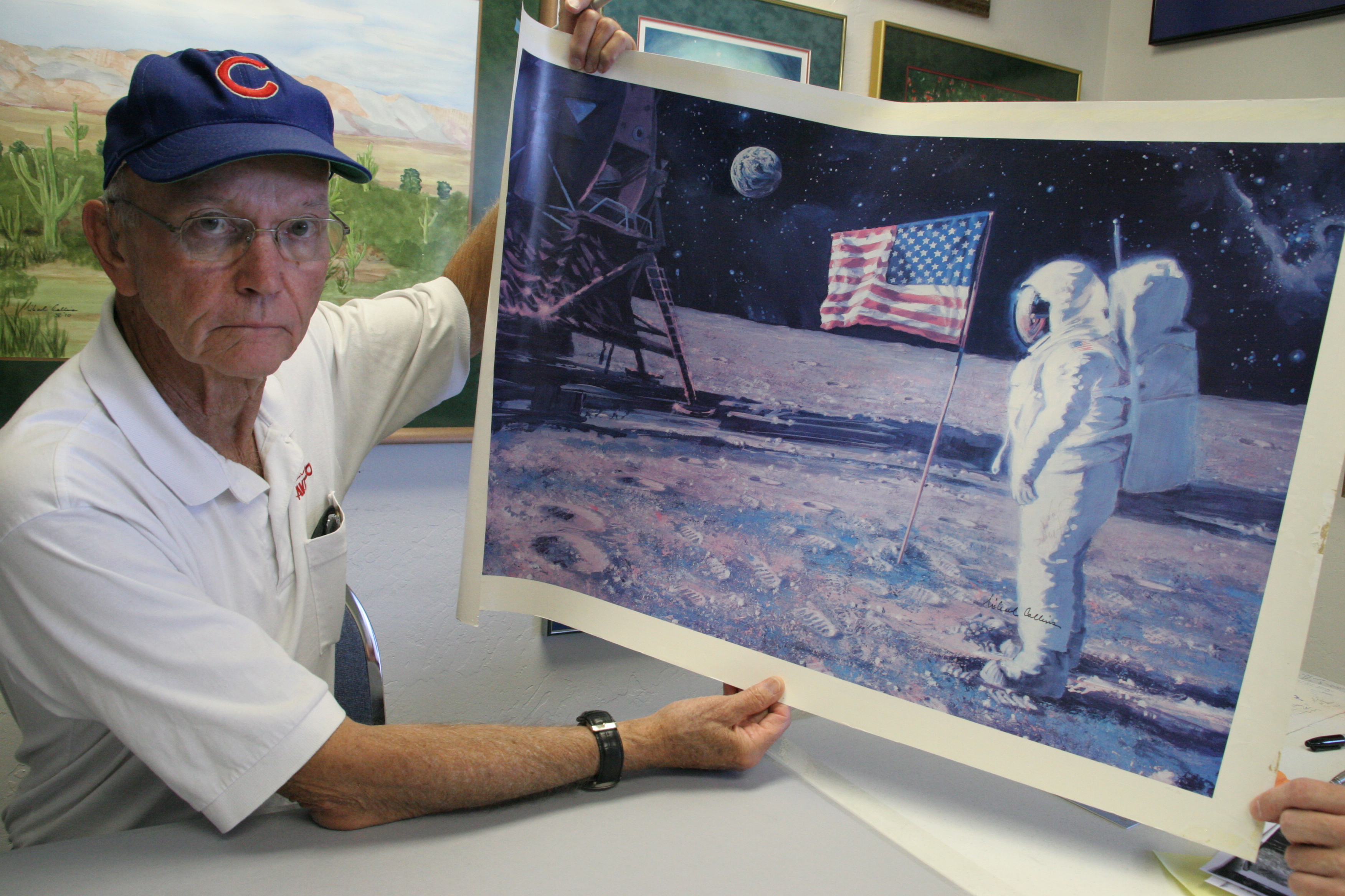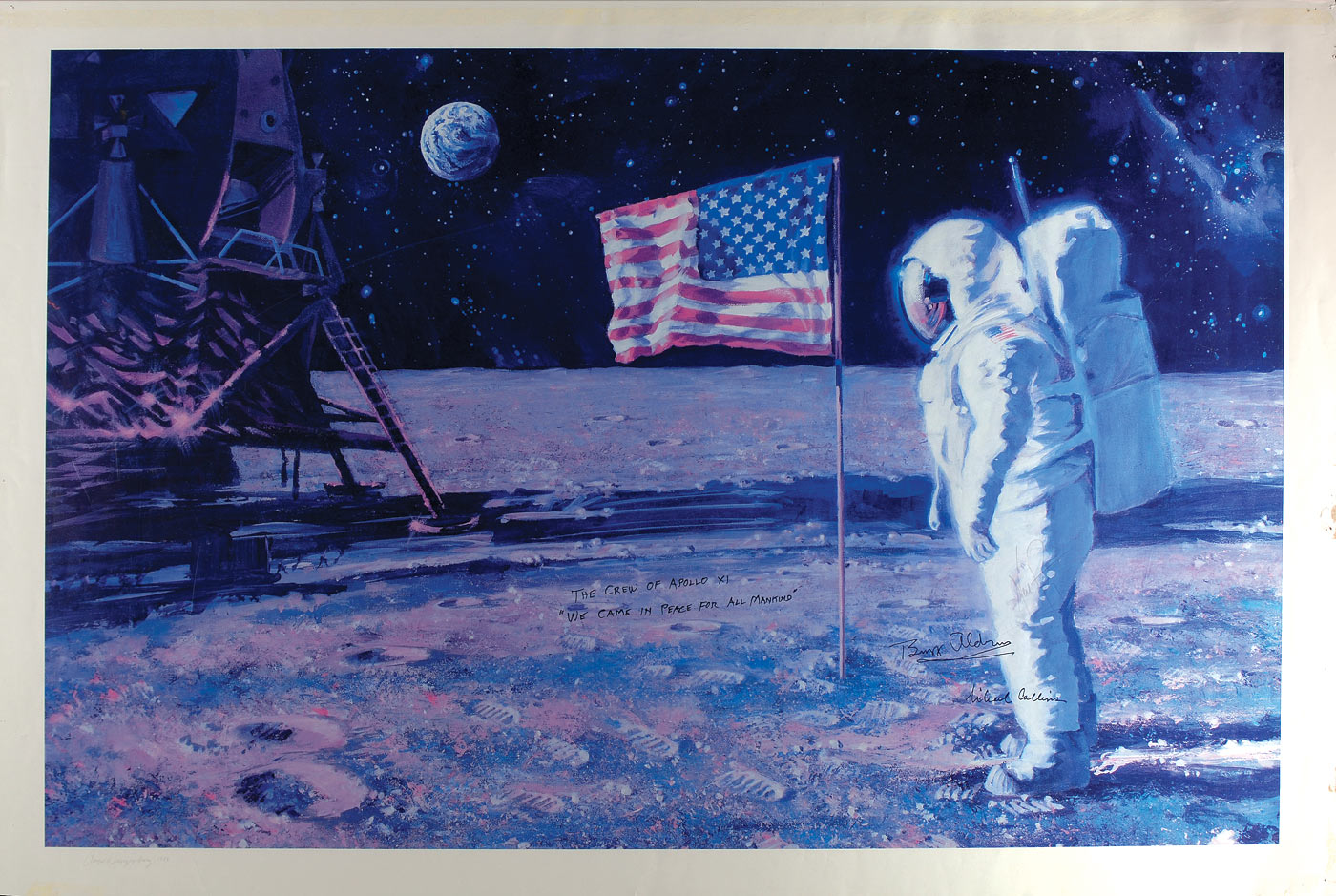 Color limited edition 36 x 34 print, numbered #485/900, signed in black felt tip by Buzz Aldrin (adding “The crew of Apollo 11 We came in peace for all mankind”), and Michael Collins, and in ink by Neil Armstrong. Also signed in pencil by artist Anne Klingenburg. Rolled and in very good condition, with wrinkling, pinholes at the corners, paper loss, long strip of old tape residue at the top border, staining along the edges, and Armstrong’s signature very light. Conditional issues along border could be matted out. The original painting was presented to Armstrong at the Neil Armstrong Air and Space Museum in Wapakoneta, Ohio in the late 1980s, and according to the consignor this print was signed by the moonwalker at that event. It was subsequently signed by the remainder of the Apollo 11 crew. Collins’ signature is accompanied by a certificate of authenticity from Astronaut Central which pictures a photo of Collins signing the print and also a CD containing several images of Collins signing and displaying the print. Also included is a CD comprised of several photos of Aldrin at Spacefest signing the print. Impeccable documentation and a lesser-seen format for Apollo 11 crew signed items.