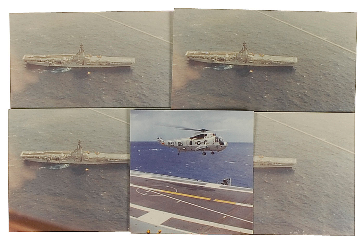 Five color glossy candid photos taken during the Apollo 11 recovery mission. Four identical 4.5 x 3 aerial photos of the USS Hornet, each signed on the reverse by members of the helicopter crew; and one 3 x 3 color glossy of a Navy helicopter landing on the Hornet, signed on the reverse by Commander Donald S. Jones. Jones served as the recovery pilot for the two most critical moon flights of Apollo VIII (first orbit around the moon) and Apollo X1 (first landing of men on the moon). In fine condition, with surface impressions from signatures on reverse.