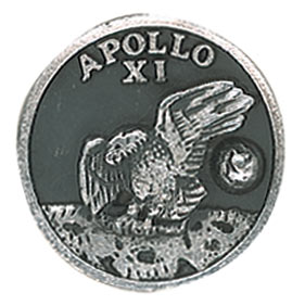 Original tie tack, .75-inch diameter, bearing an image of the Apollo 11 logo. The piece was issued in honor of the 20th anniversary of the first lunar landing. The item originates from personal collection of James McDivitt. Accompanied by a color copy of a certificate of authenticity from Novaspace.