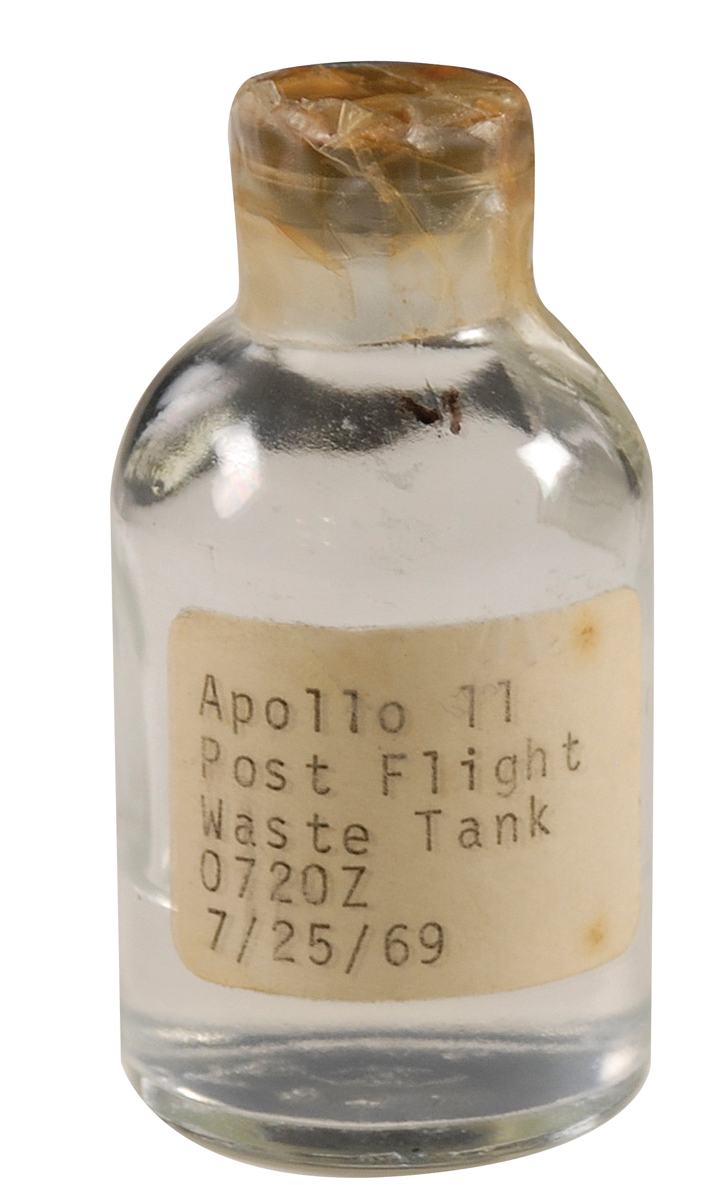 A sample of waste water taken from the Apollo 11 command module after its return to Earth. A 2.5-inch tall bottle is about one-quarter of the way full of the clear liquid. A typed label affixed to the glass reads “Apollo 11, Post Flight Waste Tank 0720Z 7/25/69.” According the consignor, the liquid is actually condensation formed as a result of the astronauts breathing, and was collected by a NASA technician from the Apollo 11 waste tank. The technician is said to be the individual who affixed the identification label. A ‘breath-taking’ artifact from the first lunar mission!