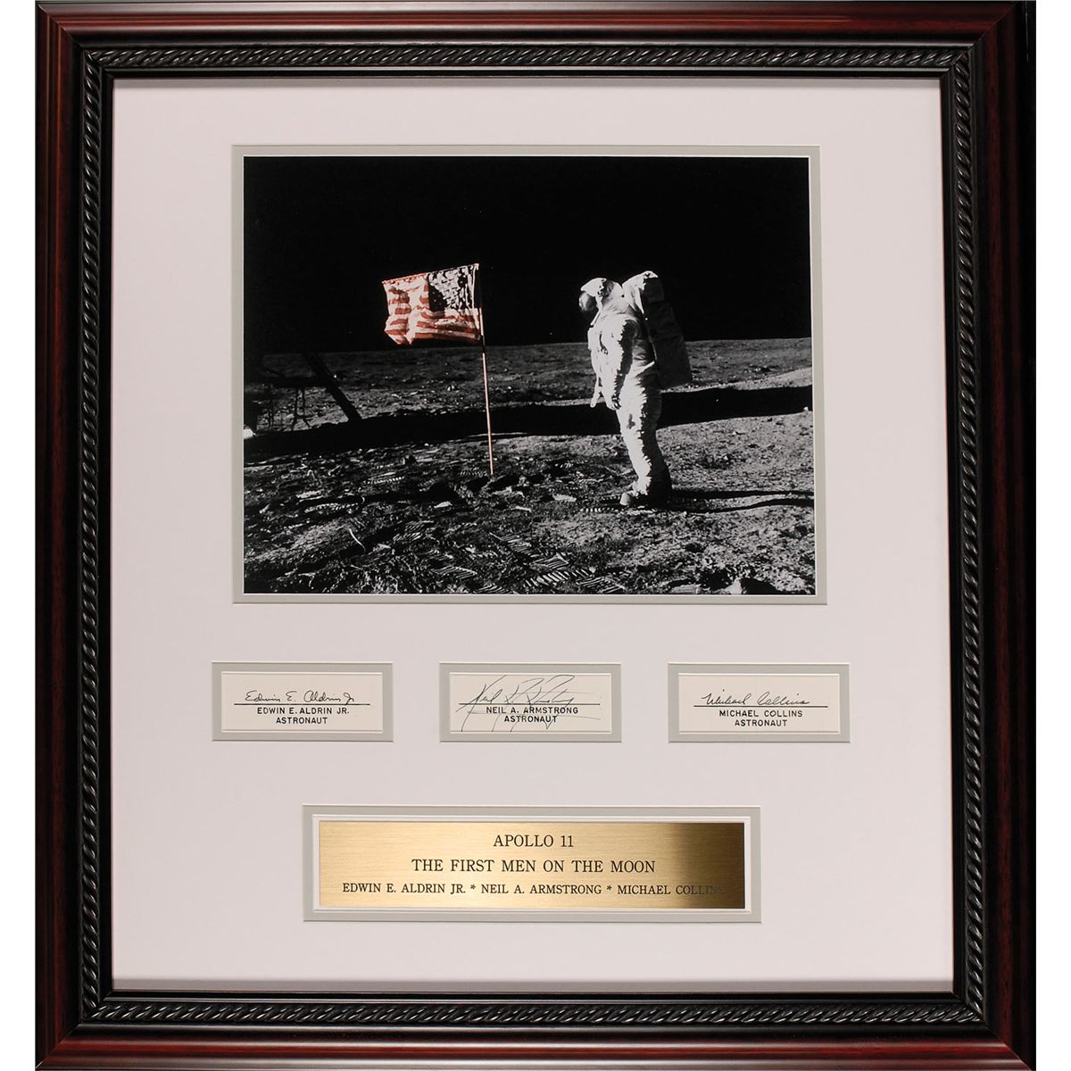 Black felt tip vintage signatures, “Neil A. Armstrong,” “Edwin E. Aldrin, Jr.,” and “Michael Collins” on individual white 3.75 x 1.5 matchbook covers. Each cover has the astronaut’s printed name and a signature line. Magnificently and archivally double-matted with a color photo of Aldrin on the moon and descriptive plaque, and framed in a high quality mahogany to an overall size of 24 x 26. In fine condition with two vertical folds (from the matchbook cover design) passing through the center of all three signatures and staple holes at the far right of each item. A copy affixed to the reverse of the frame reveals each item has a PSA/DNA authentication label affixed to its reverse. Desirable full name signatures.