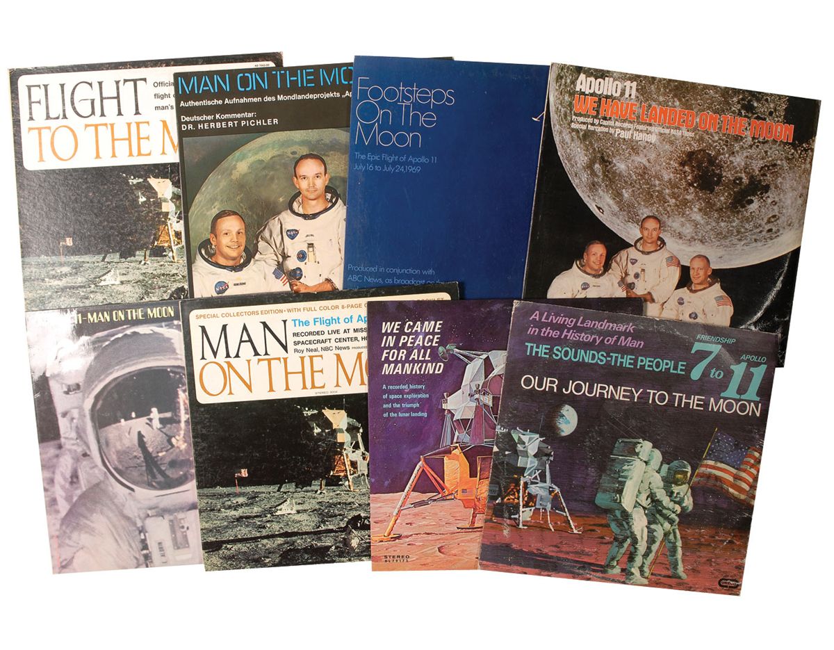 Eight items: four Apollo 11-related LP albums: Man on the Moon (in German), Flight to the Moon, Apollo 11: We Have Landed on the Moon, and Footsteps on the Moon: The Epic Flight of Apollo 11; and four Apollo 11-related 33 1/3 rpm albums: Our Journey to the Moon, We Came In Peace For All Mankind, Man On the Moon: The Flight of Apollo 11, and Apollo 11—Man on the Moon: Blast Off to Splashdown. In very good condition, with expected cover wear and rubbing, rippling to one cover from exposure to moisture, and a few edge separations.
