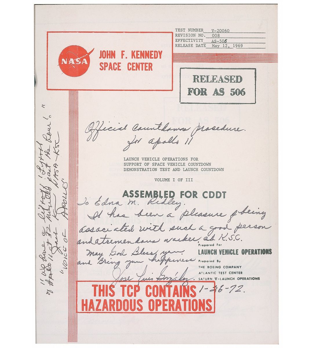 Bound three volume set of manuals entitled “Launch Vehicle Operations for Support of Space Vehicle Countdown Demonstration Test and Launch Countdown,” dated May–June 1969. Stamped on the front cover “Released for AS 506.” Over 400 pages listing procedures for the testing as well as pull out flow charts. Front cover of Volume I is signed and inscribed in black felt tip and ink, “Official countdown procedure for Apollo 11. To Edna M. Ridley, It has been a pleasure of being associated with such a good person and a tremendous worker at K.S.C. May God bless you and bring you happiness, Jose Luis Gonzalez, 1-26-72,” and “‘We have liftoff! Liftoff of Apollo 11 at 32 minutes past the hour!’ Jack King, NASA–KSC ‘Voice of Apollo.’” In fine condition.