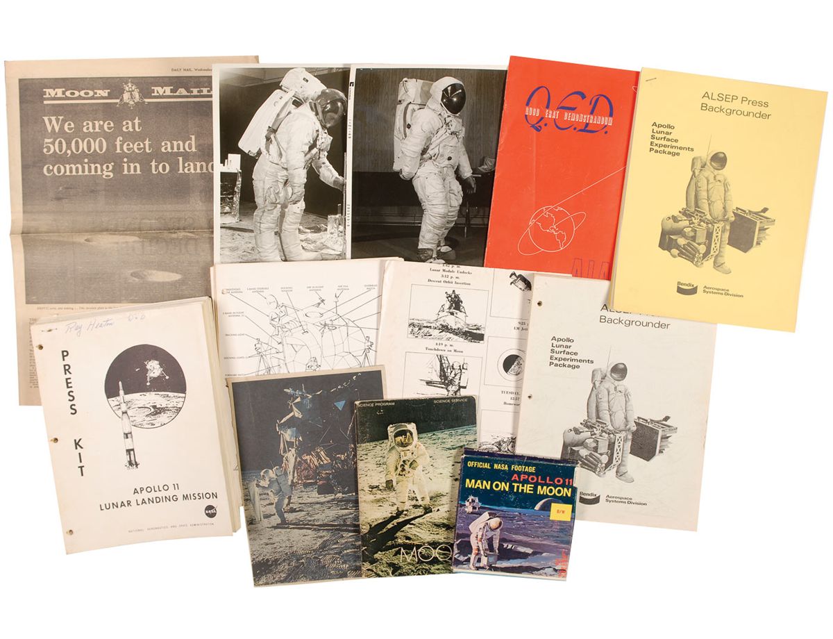 Thirteen items: Apollo 11 Lunar Landing press kit, 8.25 x 10.5, 250 pages, providing very detailed information and diagrams related to the first moonwalks; booklet entitled ‘Moon,’ 5.5 x 8.25, 64 pages, published by Nelson Doubleday, Inc., in 1970. The program served as an introduction to young adults about the lunar program; a black-and-white 8mm film in its original box issued by NASA, entitled “Official NASA Footage Apollo 11 Man on the Moon.” Released by Columbia Pictures, the film offered ‘home movies’ of the historic lunar landing; and a collection of ten items, each pertaining to the Apollo 11 launch. Items are: one-page NASA press release regarding the launch, NASA pre-launch briefing informational packet, NASA Public Information Division “Space Sheet,” NASA/Grumman Apollo lunar module narrative, July 1969 issue of the Canaveral Section Report, two press packets from Bendix Aerospace Systems Division explaining the Apollo Lunar Surface Experiments Package, a July 9 copy of “Moon Mail”; and two 8 x 10 glossy photos of one of the Apollo 11 astronauts ‘practicing’ in their space suit. In very good to fine condition, with some mild toning and the expected wear.