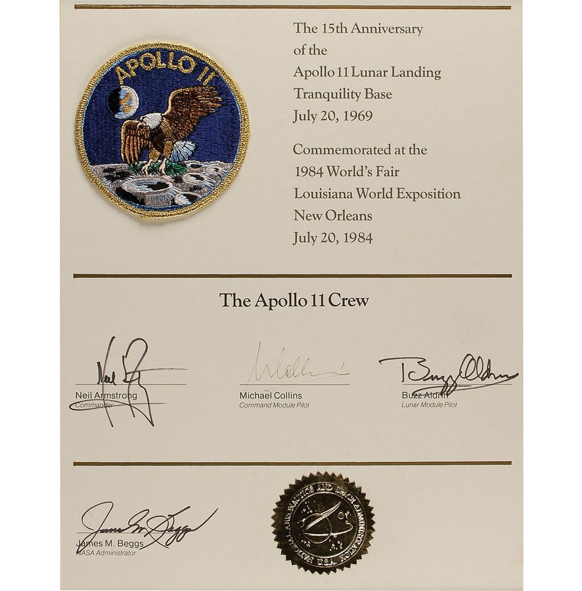 Very nice Apollo 11 15th anniversary commemorative citation, 10.5 x 13.5, commemorated at the 1984 World’s Fair, Louisiana World Exposition, on July 20, 1984, signed in black felt tip by crew members Neil Armstrong, Michael Collins, and Buzz Aldrin. Also signed by NASA administrator James M. Beggs, and bearing a souvenir Apollo 11 mission patch affixed to top left. A gold foil NASA seal is affixed. The citation is permanently mounted and triple-matted to an overall size of 16.5 x 19.5. In fine condition, with a couple spots of soiling and Collins’ signature a bit light. An unusual association between the two events!