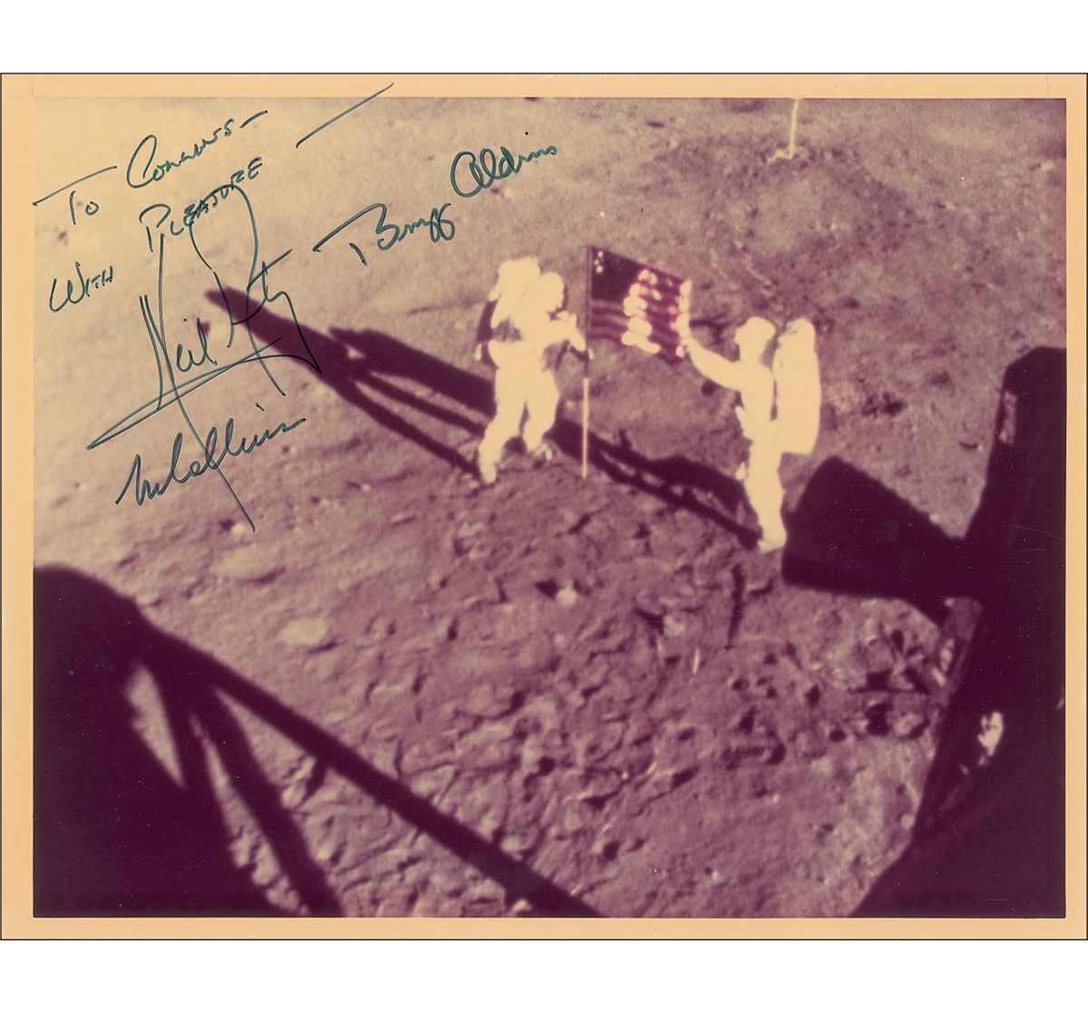 Color vintage glossy 8 x 10 NASA photo of Armstrong and Aldrin flanking the first American flag on the moon, affixed to a foam core mount by its top edge, signed and inscribed in black felt tip, “To Collins—With Pleasure—Neil Armstrong,” “Buzz Aldrin,” and “Michael Collins.” In fine condition, with a trivial ding to the top edge. Accompanied by a letter of authenticity from PSA/DNA. This image was developed from film exposed by the 16 mm camera mounted to the lunar module. An exceptional and highly-desirable piece for any substantial collection.