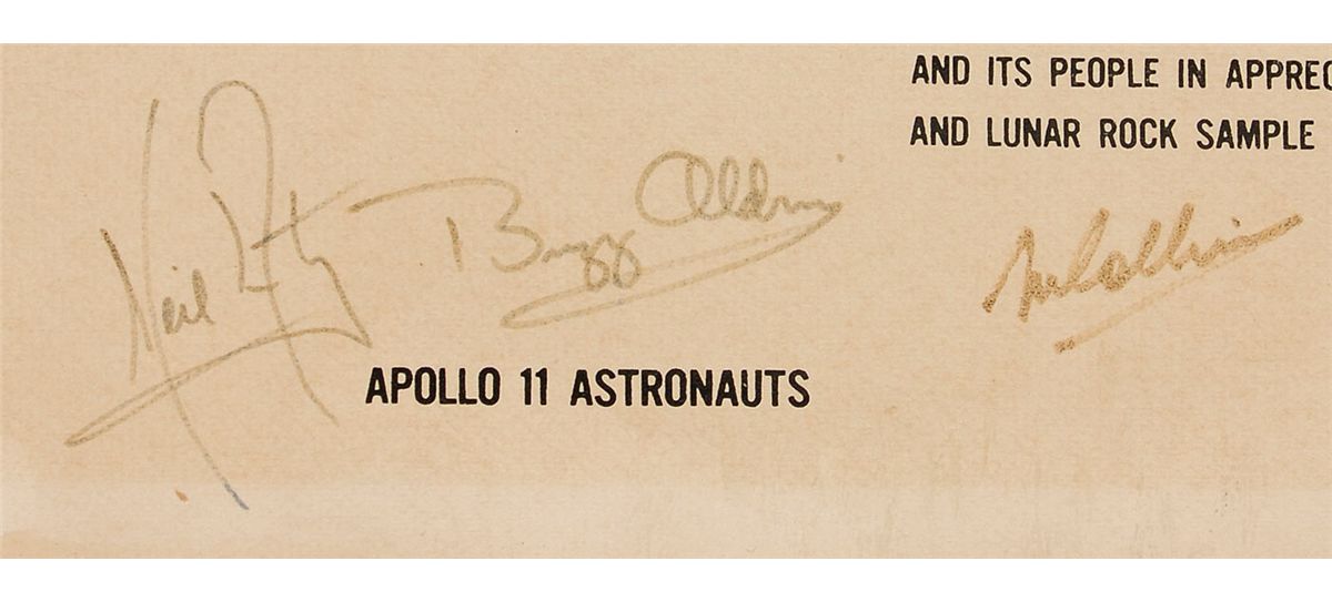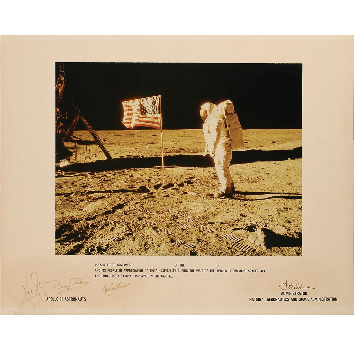 Color glossy 14 x 11 photo of Buzz Aldrin facing the flag on the lunar surface during the Apollo 11 mission, affixed to its original 20 x 16 mount. Mount bears an incomplete printed inscription which reads, “Presented to the Governor—of the—of—and its people in appreciation of their hospitality during the visit of the Apollo 11 Command Spacecraft and lunar rock sample displayed in the Capital,” and is signed on the mount in black felt tip by Neil Armstrong, Buzz Aldrin, and Michael Collins. Also signed on the mount by NASA Administrator Thomas Paine. Mount is affixed to a slightly larger off-white mount. Light uniform fading to all three signatures, all of which remain completely legible, and light toning to the mount from previous display, otherwise fine condition. Accompanied by a photocopied letter of provenance from the recipient of the photo which reads, “This Apollo 11…photo was given to me by Buford Ellington, Governor of Tennessee in 1970, via my father Ernie Keller, the Chief of Public Relations (Governor’s Office). This photo was given to Gov. Ellington during ‘The Apollo 11 Fifty-State Tour,’ following the first manned lunar expedition. He decided not to have the lettering completed, and instead gave it to my father to be given to me, Ted W. Keller. I was an Aerospace Engineering student at the University of Tennessee at the time and the Governor knew what it would mean to me to have this inspiration. It has been in my possession until February 2012. At the time, I was told that the print was a 1st generation hand-enlargement from the original negative returned from the moon.” In 1970, the Apollo 11 command module, a lunar sample, and the crew visited all 50 state capitals, ending in Washington, D. C., with the module winding up at the Smithsonian Institute. The crew and module stopped in Tennessee from September 18–21, 1970. A very scarce unissued presentation portrait with exceptional provenance.