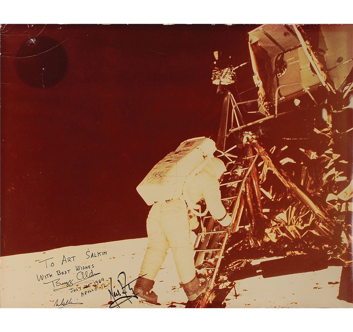 Color vintage semi-glossy 19.75 x 16 photo of the Apollo 11 lunar landing, with Buzz Aldrin descending to the moon’s surface, signed and inscribed in black felt tip, “To Art Salkin, With best wishes, Buzz Aldrin, July 20, 1969,” “Neil Armstrong,” and “Michael Collins.” Top edge of the photo is affixed to a cardstock mount of the same size. Light circle of toning to top left from a previously affixed Apollo 11 patch (included), scattered creasing, heavier to top left), rippling and surface marks from possible exposure to moisture, a few trivial areas of surface loss at the edges, and trimmed edges, other wise very good condition.