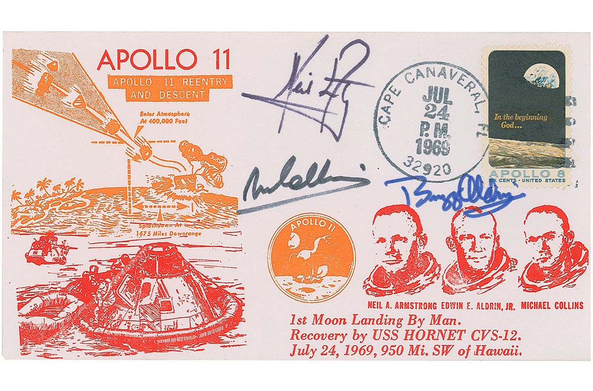 Commemorative cover with a cachet honoring the Apollo 11 reentry and descent, signed in black felt tip by Neil Armstrong and Michael Collins and in blue felt tip by Buzz Aldrin. In fine condition. Uncommon in this form as the Apollo 11 crew have long refused to sign any type of covers.