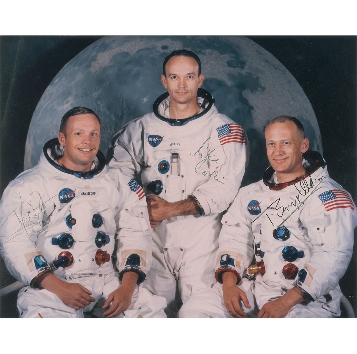 Color satin-finish 10 x 8 photo of the Apollo 11 prime crew posing together in their spacesuits against a lunar background, signed in black ballpoint. A crease to top left corner, a few other light bends and creases, and mild skipping to Armstrong’s signature, which is also a couple shades light, but still completely legible, otherwise fine condition.