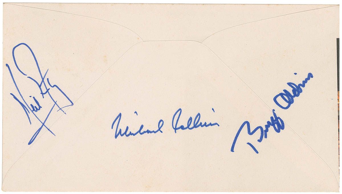 Uncancelled Apollo 11 ‘Type 1’ insurance cover, having no stamps or postal cancellations, signed on the reverse in blue felt tip by Neil Armstrong, Buzz Aldrin, and Michael Collins. In fine condition. Cover originates from the collection of an employee in the crew quarters and signatures date to 1969-1970. Also accompanied by another unsigned and uncancelled cover, three color NASA photos of the crew and mission, an Apollo 11 patch, and a NASA patch.`